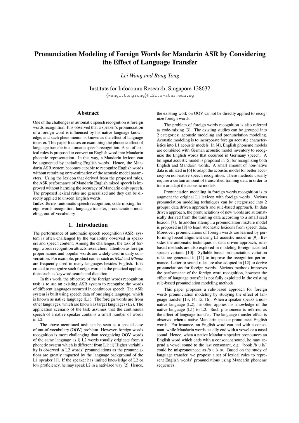 One of the challenges in automatic speech recognition is foreign words recognition. It is observed that a speaker's pronunciation of a foreign word is influenced by his native language knowledge, and such phenomenon is known as the effect of language transfer. This paper focuses on examining the phonetic effect of language transfer in automatic speech recognition. A set of lexical rules is proposed to convert an English word into Mandarin phonetic representation. In this way, a Mandarin lexicon can be augmented by including English words. Hence, the Mandarin ASR system becomes capable to recognize English words without retraining or re-estimation of the acoustic model parameters. Using the lexicon that derived from the proposed rules, the ASR performance of Mandarin English mixed speech is improved without harming the accuracy of Mandarin only speech. The proposed lexical rules are generalized and they can be directly applied to unseen English words.