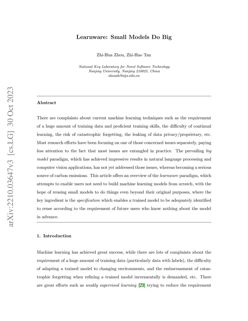 There are complaints about current machine learning techniques such as the requirement of a huge amount of training data and proficient training skills, the difficulty of continual learning, the risk of catastrophic forgetting, the leaking of data privacy/proprietary, etc. Most research efforts have been focusing on one of those concerned issues separately, paying less attention to the fact that most issues are entangled in practice. The prevailing big model paradigm, which has achieved impressive results in natural language processing and computer vision applications, has not yet addressed those issues, whereas becoming a serious source of carbon emissions. This article offers an overview of the learnware paradigm, which attempts to enable users not need to build machine learning models from scratch, with the hope of reusing small models to do things even beyond their original purposes, where the key ingredient is the specification which enables a trained model to be adequately identified to reuse according to the requirement of future users who know nothing about the model in advance.