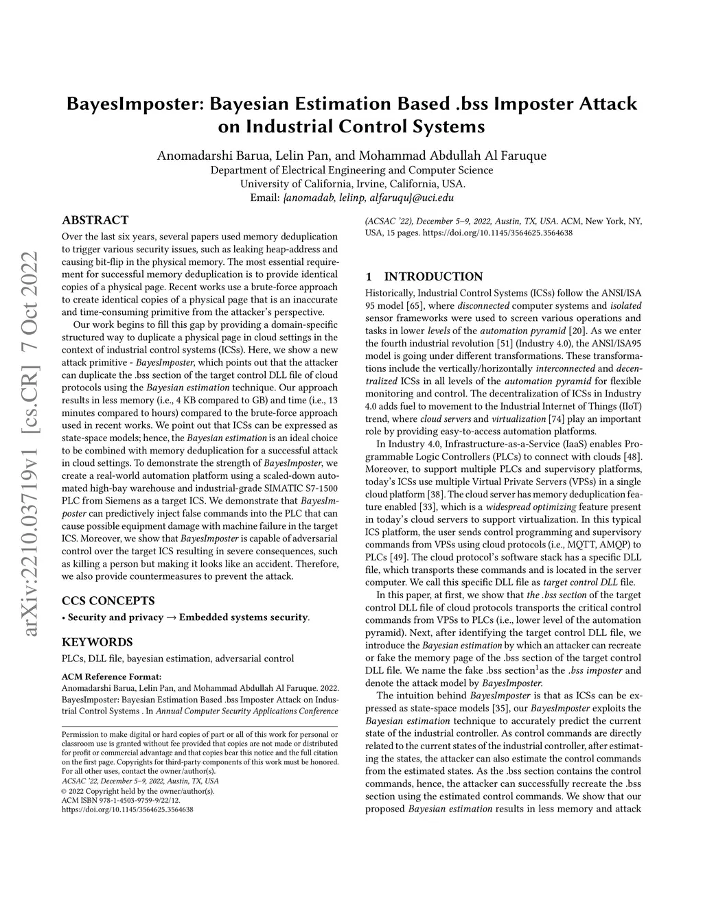 Over the last six years, several papers used memory deduplication to trigger various security issues, such as leaking heap-address and causing bit-flip in the physical memory. The most essential requirement for successful memory deduplication is to provide identical copies of a physical page. Recent works use a brute-force approach to create identical copies of a physical page that is an inaccurate and time-consuming primitive from the attacker's perspective. Our work begins to fill this gap by providing a domain-specific structured way to duplicate a physical page in cloud settings in the context of industrial control systems (ICSs). Here, we show a new attack primitive - \textit{BayesImposter}, which points out that the attacker can duplicate the .bss section of the target control DLL file of cloud protocols using the \textit{Bayesian estimation} technique. Our approach results in less memory (i.e., 4 KB compared to GB) and time (i.e., 13 minutes compared to hours) compared to the brute-force approach used in recent works. We point out that ICSs can be expressed as state-space models; hence, the \textit{Bayesian estimation} is an ideal choice to be combined with memory deduplication for a successful attack in cloud settings. To demonstrate the strength of \textit{BayesImposter}, we create a real-world automation platform using a scaled-down automated high-bay warehouse and industrial-grade SIMATIC S7-1500 PLC from Siemens as a target ICS. We demonstrate that \textit{BayesImposter} can predictively inject false commands into the PLC that can cause possible equipment damage with machine failure in the target ICS. Moreover, we show that \textit{BayesImposter} is capable of adversarial control over the target ICS resulting in severe consequences, such as killing a person but making it looks like an accident. Therefore, we also provide countermeasures to prevent the attack.