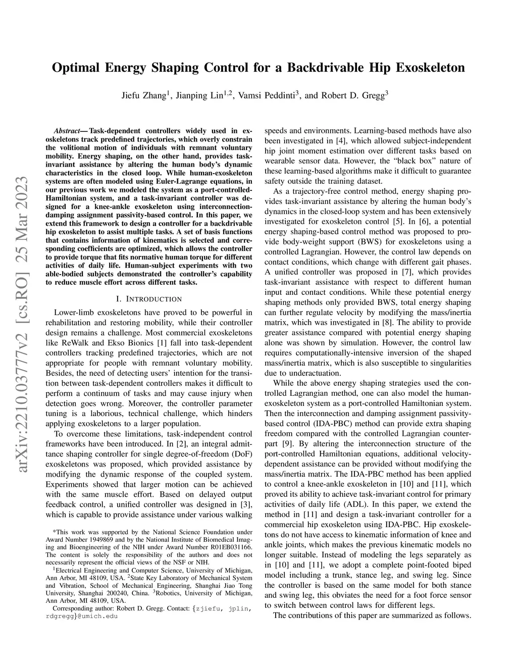 Optimal Energy Shaping Control for a Backdrivable Hip Exoskeleton