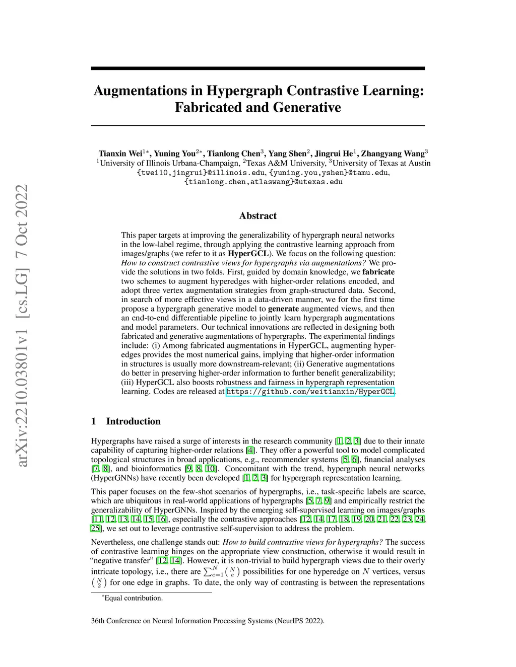 This paper targets at improving the generalizability of hypergraph neural networks in the low-label regime, through applying the contrastive learning approach from images/graphs (we refer to it as HyperGCL). We focus on the following question: How to construct contrastive views for hypergraphs via augmentations? We provide the solutions in two folds. First, guided by domain knowledge, we fabricate two schemes to augment hyperedges with higher-order relations encoded, and adopt three vertex augmentation strategies from graph-structured data. Second, in search of more effective views in a data-driven manner, we for the first time propose a hypergraph generative model to generate augmented views, and then an end-to-end differentiable pipeline to jointly learn hypergraph augmentations and model parameters. Our technical innovations are reflected in designing both fabricated and generative augmentations of hypergraphs. The experimental findings include: (i) Among fabricated augmentations in HyperGCL, augmenting hyperedges provides the most numerical gains, implying that higher-order information in structures is usually more downstream-relevant; (ii) Generative augmentations do better in preserving higher-order information to further benefit generalizability; (iii) HyperGCL also boosts robustness and fairness in hypergraph representation learning. Codes are released at https://github.com/weitianxin/HyperGCL.