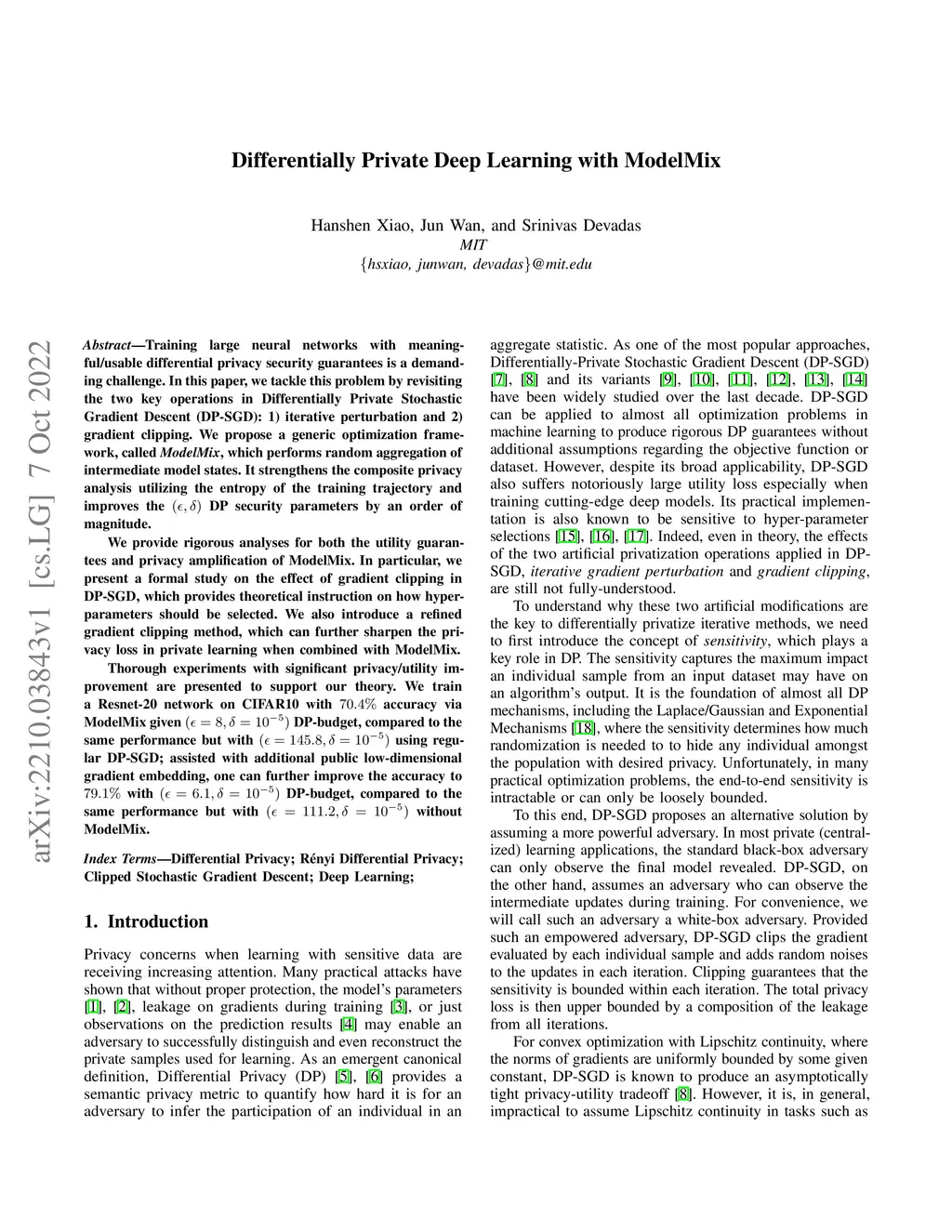 Training large neural networks with meaningful/usable differential privacy security guarantees is a demanding challenge. In this paper, we tackle this problem by revisiting the two key operations in Differentially Private Stochastic Gradient Descent (DP-SGD): 1) iterative perturbation and 2) gradient clipping. We propose a generic optimization framework, called {\em ModelMix}, which performs random aggregation of intermediate model states. It strengthens the composite privacy analysis utilizing the entropy of the training trajectory and improves the DP security parameters by an order of magnitude. We provide rigorous analyses for both the utility guarantees and privacy amplification of ModelMix. In particular, we present a formal study on the effect of gradient clipping in DP-SGD, which provides theoretical instruction on how hyper-parameters should be selected. We also introduce a refined gradient clipping method, which can further sharpen the privacy loss in private learning when combined with ModelMix. Thorough experiments with significant privacy/utility improvement are presented to support our theory. We train a Resnet-20 network on CIFAR10 with accuracy via ModelMix given DP-budget, compared to the same performance but with using regular DP-SGD; assisted with additional public low-dimensional gradient embedding, one can further improve the accuracy to with DP-budget, compared to the same performance but with without ModelMix.