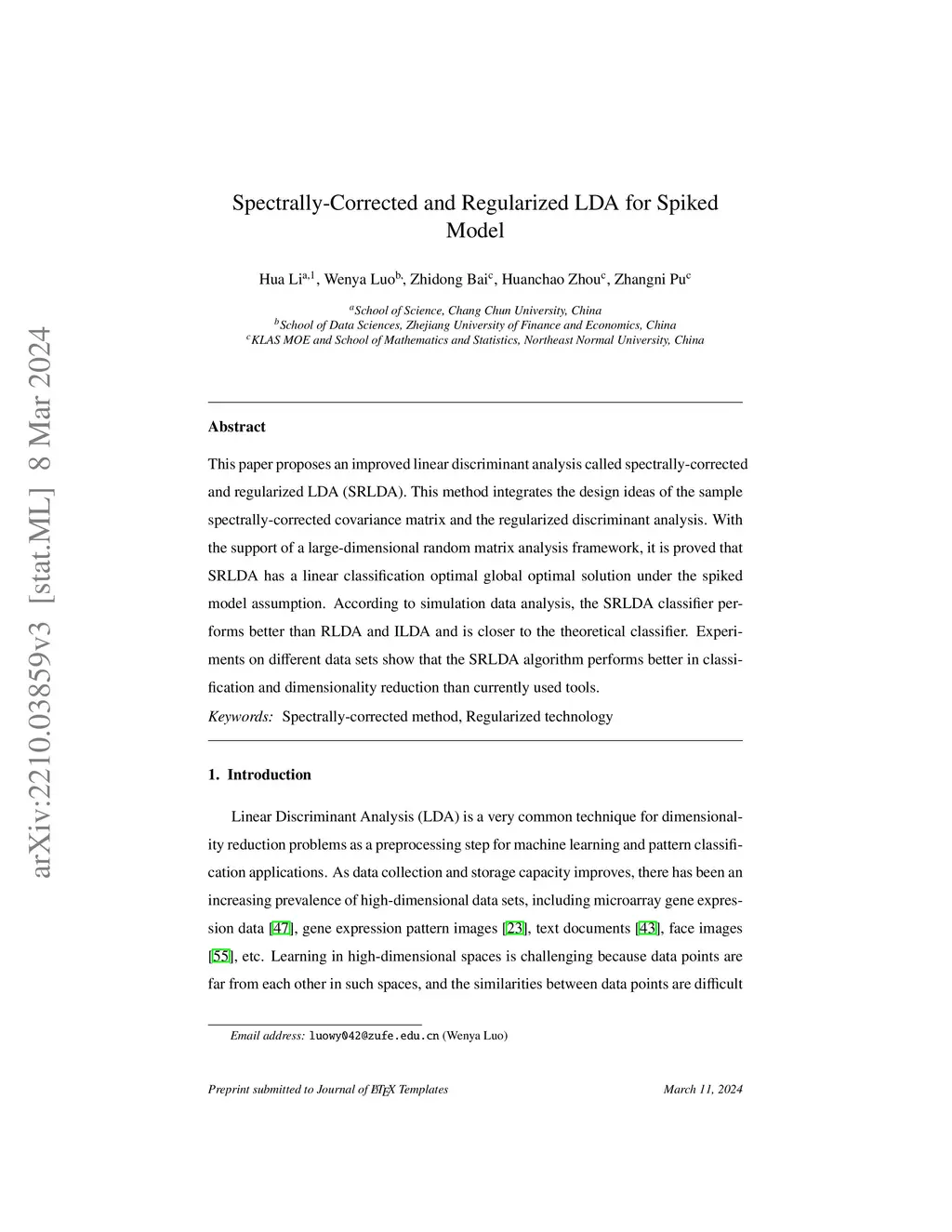 This paper proposes an improved linear discriminant analysis called spectrally-corrected and regularized LDA (SRLDA). This method integrates the design ideas of the sample spectrally-corrected covariance matrix and the regularized discriminant analysis. With the support of a large-dimensional random matrix analysis framework, it is proved that SRLDA has a linear classification global optimal solution under the spiked model assumption. According to simulation data analysis, the SRLDA classifier performs better than RLDA and ILDA and is closer to the theoretical classifier. Experiments on different data sets show that the SRLDA algorithm performs better in classification and dimensionality reduction than currently used tools.