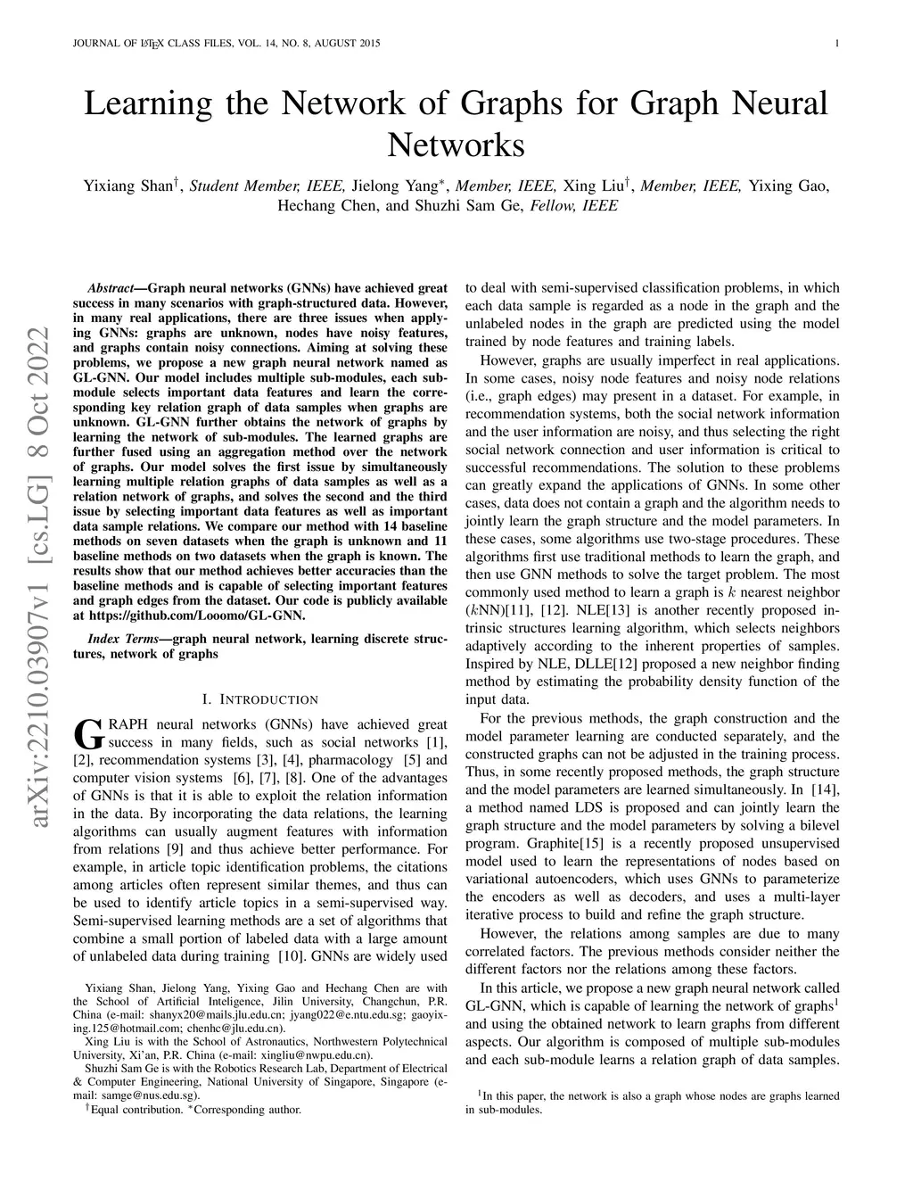 Graph neural networks (GNNs) have achieved great success in many scenarios with graph-structured data. However, in many real applications, there are three issues when applying GNNs: graphs are unknown, nodes have noisy features, and graphs contain noisy connections. Aiming at solving these problems, we propose a new graph neural network named as GL-GNN. Our model includes multiple sub-modules, each sub-module selects important data features and learn the corresponding key relation graph of data samples when graphs are unknown. GL-GNN further obtains the network of graphs by learning the network of sub-modules. The learned graphs are further fused using an aggregation method over the network of graphs. Our model solves the first issue by simultaneously learning multiple relation graphs of data samples as well as a relation network of graphs, and solves the second and the third issue by selecting important data features as well as important data sample relations. We compare our method with 14 baseline methods on seven datasets when the graph is unknown and 11 baseline methods on two datasets when the graph is known. The results show that our method achieves better accuracies than the baseline methods and is capable of selecting important features and graph edges from the dataset. Our code will be publicly available at \url{https://github.com/Looomo/GL-GNN}.