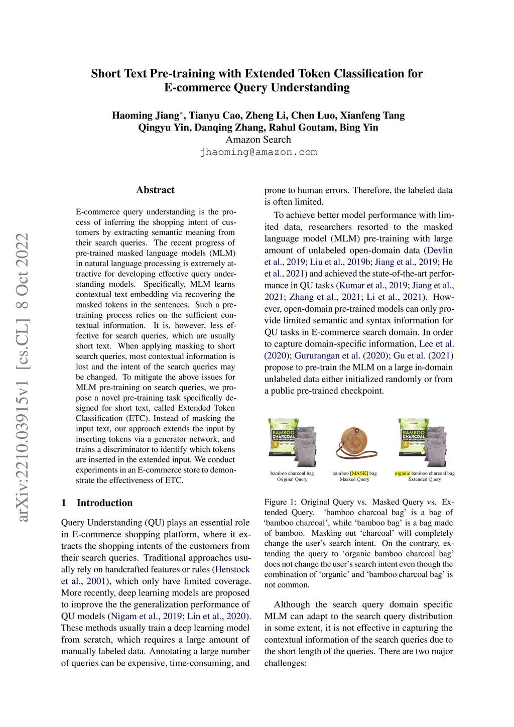 E-commerce query understanding is the process of inferring the shopping intent of customers by extracting semantic meaning from their search queries. The recent progress of pre-trained masked language models (MLM) in natural language processing is extremely attractive for developing effective query understanding models. Specifically, MLM learns contextual text embedding via recovering the masked tokens in the sentences. Such a pre-training process relies on the sufficient contextual information. It is, however, less effective for search queries, which are usually short text. When applying masking to short search queries, most contextual information is lost and the intent of the search queries may be changed. To mitigate the above issues for MLM pre-training on search queries, we propose a novel pre-training task specifically designed for short text, called Extended Token Classification (ETC). Instead of masking the input text, our approach extends the input by inserting tokens via a generator network, and trains a discriminator to identify which tokens are inserted in the extended input. We conduct experiments in an E-commerce store to demonstrate the effectiveness of ETC.