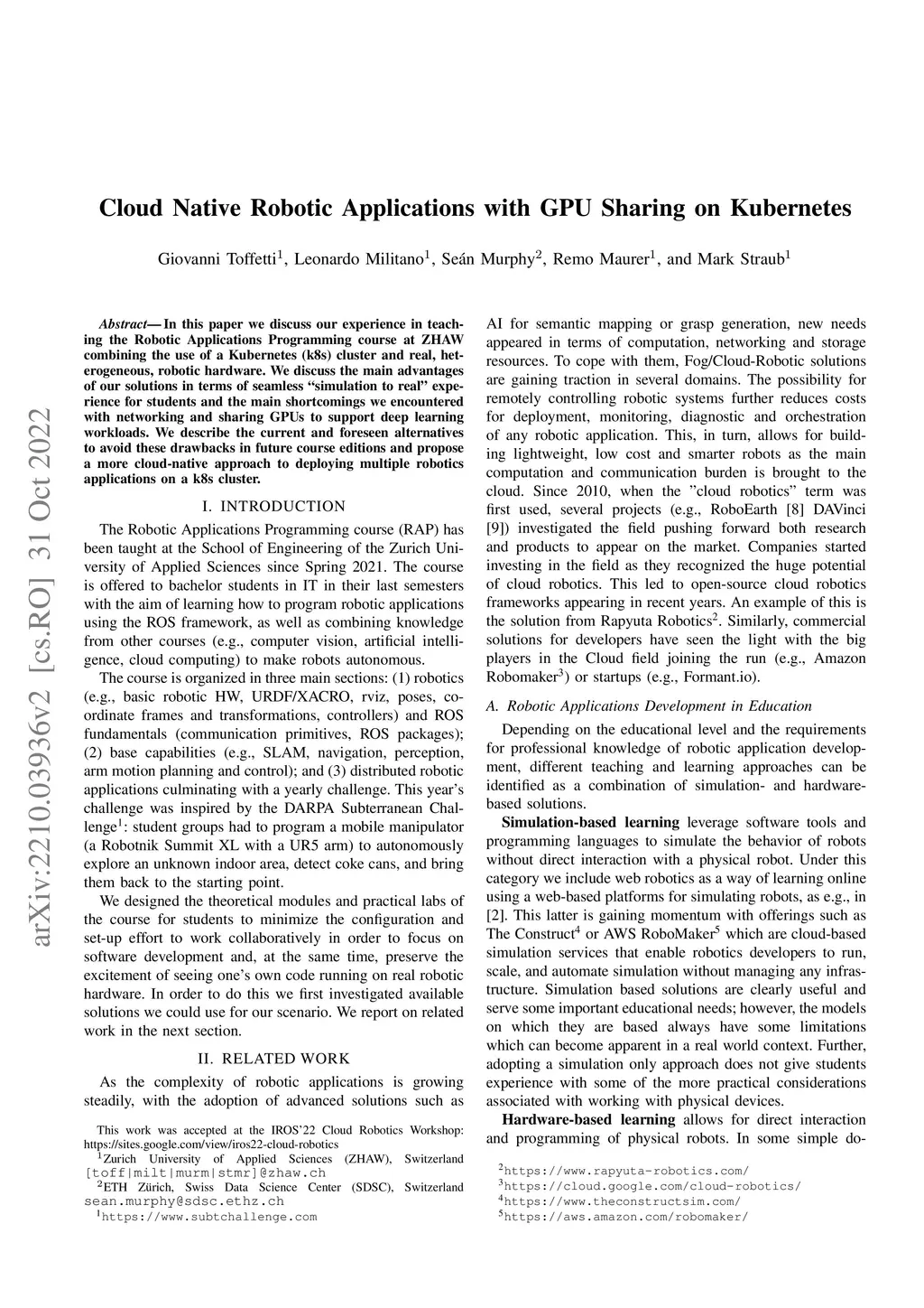 In this paper we discuss our experience in teaching the Robotic Applications Programming course at ZHAW combining the use of a Kubernetes (k8s) cluster and real, heterogeneous, robotic hardware. We discuss the main advantages of our solutions in terms of seamless simulation-to-real experience for students and the main shortcomings we encountered with networking and sharing GPUs to support deep learning workloads. We describe the current and foreseen alternatives to avoid these drawbacks in future course editions and propose a more cloud-native approach to deploying multiple robotics applications on a k8s cluster.