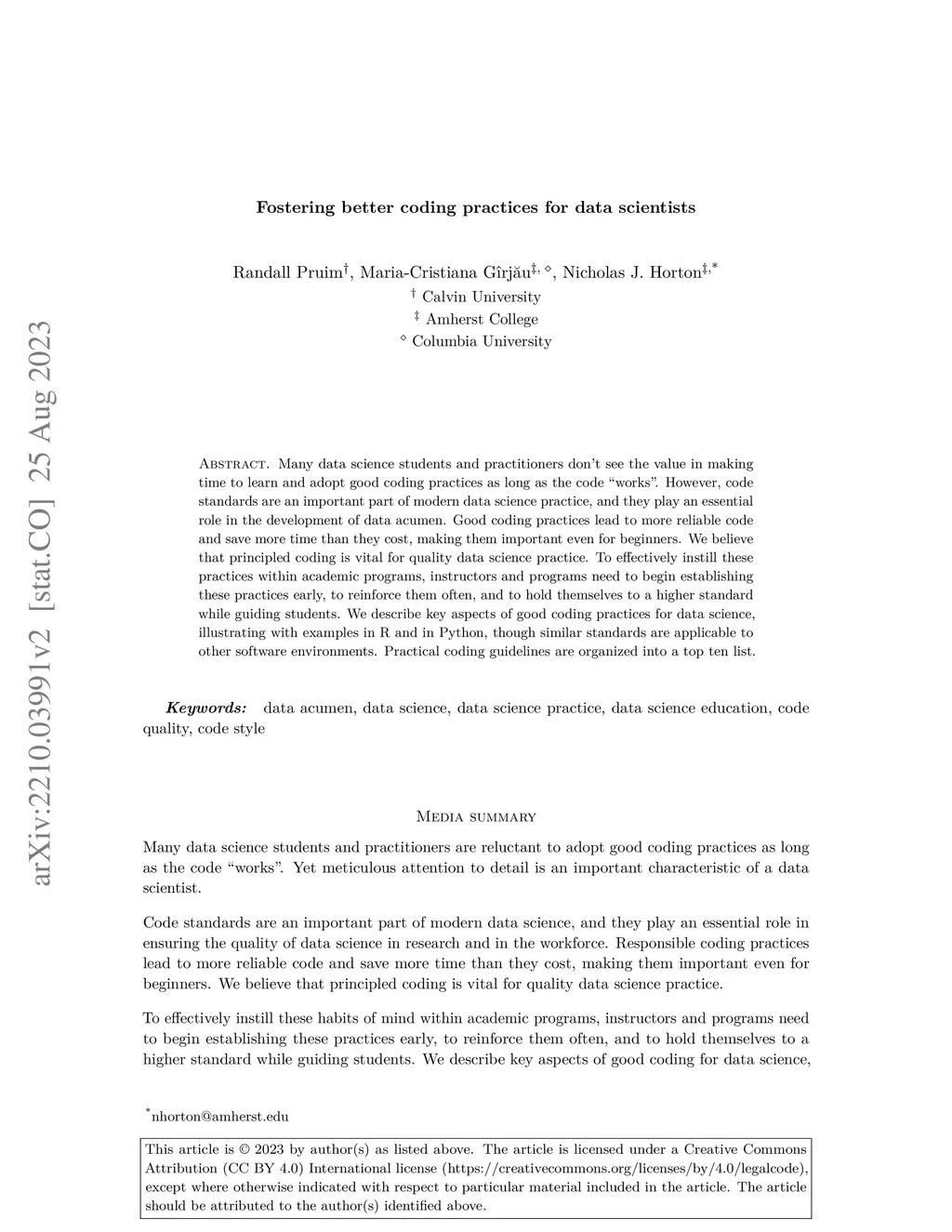 Many data science students and practitioners don't see the value in making time to learn and adopt good coding practices as long as the code "works". However, code standards are an important part of modern data science practice, and they play an essential role in the development of data acumen. Good coding practices lead to more reliable code and save more time than they cost, making them important even for beginners. We believe that principled coding is vital for quality data science practice. To effectively instill these practices within academic programs, instructors and programs need to begin establishing these practices early, to reinforce them often, and to hold themselves to a higher standard while guiding students. We describe key aspects of good coding practices for data science, illustrating with examples in R and in Python, though similar standards are applicable to other software environments. Practical coding guidelines are organized into a top ten list.