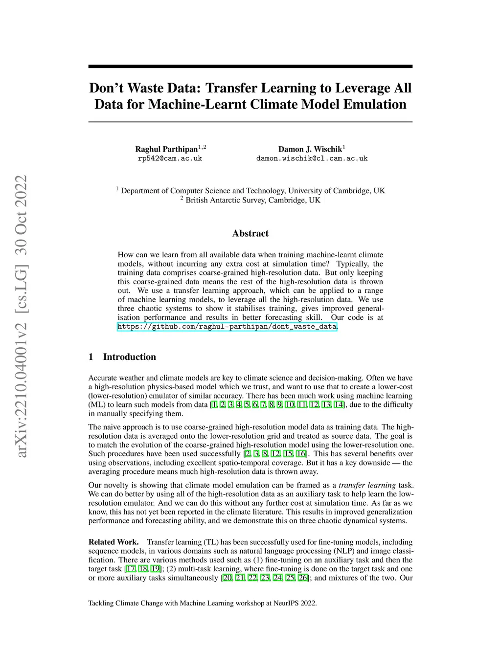 How can we learn from all available data when training machine-learnt climate models, without incurring any extra cost at simulation time? Typically, the training data comprises coarse-grained high-resolution data. But only keeping this coarse-grained data means the rest of the high-resolution data is thrown out. We use a transfer learning approach, which can be applied to a range of machine learning models, to leverage all the high-resolution data. We use three chaotic systems to show it stabilises training, gives improved generalisation performance and results in better forecasting skill. Our code is at https://github.com/raghul-parthipan/dont_waste_data