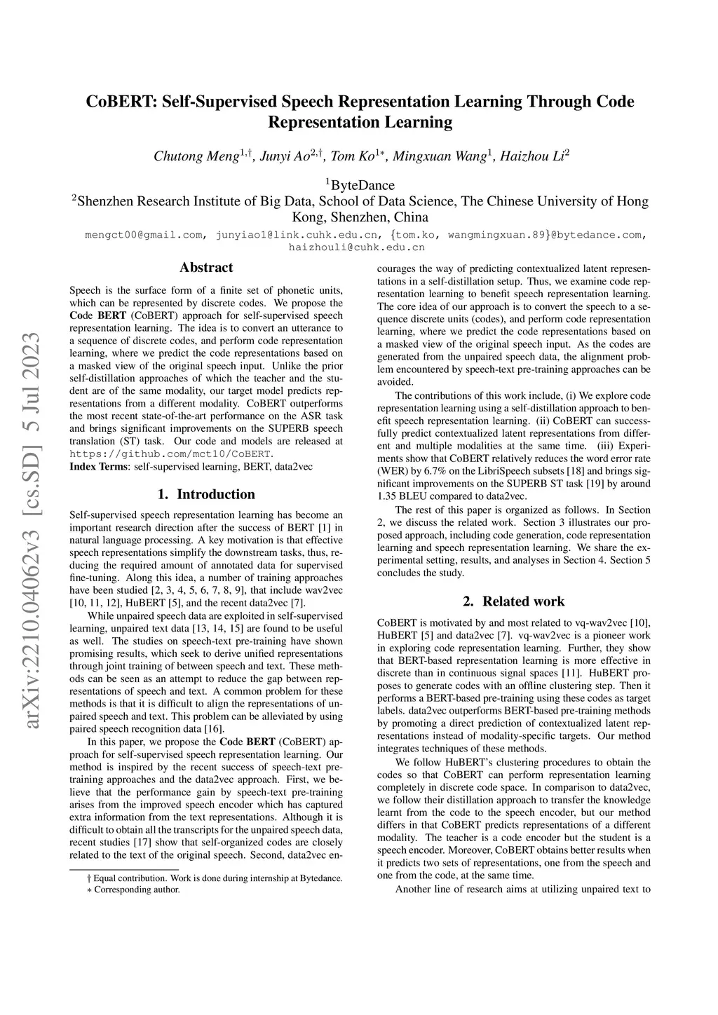CoBERT: Self-Supervised Speech Representation Learning Through Code