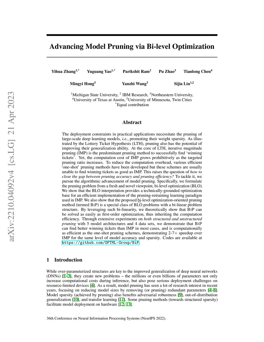 The deployment constraints in practical applications necessitate the pruning of large-scale deep learning models, i.e., promoting their weight sparsity. As illustrated by the Lottery Ticket Hypothesis (LTH), pruning also has the potential of improving their generalization ability. At the core of LTH, iterative magnitude pruning (IMP) is the predominant pruning method to successfully find 'winning tickets'. Yet, the computation cost of IMP grows prohibitively as the targeted pruning ratio increases. To reduce the computation overhead, various efficient óne-shot' pruning methods have been developed, but these schemes are usually unable to find winning tickets as good as IMP. This raises the question of how to close the gap between pruning accuracy and pruning efficiency? To tackle it, we pursue the algorithmic advancement of model pruning. Specifically, we formulate the pruning problem from a fresh and novel viewpoint, bi-level optimization (BLO). We show that the BLO interpretation provides a technically-grounded optimization base for an efficient implementation of the pruning-retraining learning paradigm used in IMP. We also show that the proposed bi-level optimization-oriented pruning method (termed BiP) is a special class of BLO problems with a bi-linear problem structure. By leveraging such bi-linearity, we theoretically show that BiP can be solved as easily as first-order optimization, thus inheriting the computation efficiency. Through extensive experiments on both structured and unstructured pruning with 5 model architectures and 4 data sets, we demonstrate that BiP can find better winning tickets than IMP in most cases, and is computationally as efficient as the one-shot pruning schemes, demonstrating 2-7 times speedup over IMP for the same level of model accuracy and sparsity.