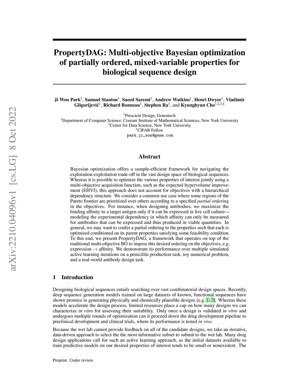 Bayesian optimization offers a sample-efficient framework for navigating the exploration-exploitation trade-off in the vast design space of biological sequences. Whereas it is possible to optimize the various properties of interest jointly using a multi-objective acquisition function, such as the expected hypervolume improvement (EHVI), this approach does not account for objectives with a hierarchical dependency structure. We consider a common use case where some regions of the Pareto frontier are prioritized over others according to a specified in the objectives. For instance, when designing antibodies, we would like to maximize the binding affinity to a target antigen only if it can be expressed in live cell culture -- modeling the experimental dependency in which affinity can only be measured for antibodies that can be expressed and thus produced in viable quantities. In general, we may want to confer a partial ordering to the properties such that each property is optimized conditioned on its parent properties satisfying some feasibility condition. To this end, we present PropertyDAG, a framework that operates on top of the traditional multi-objective BO to impose this desired ordering on the objectives, e.g. expression affinity. We demonstrate its performance over multiple simulated active learning iterations on a penicillin production task, toy numerical problem, and a real-world antibody design task.