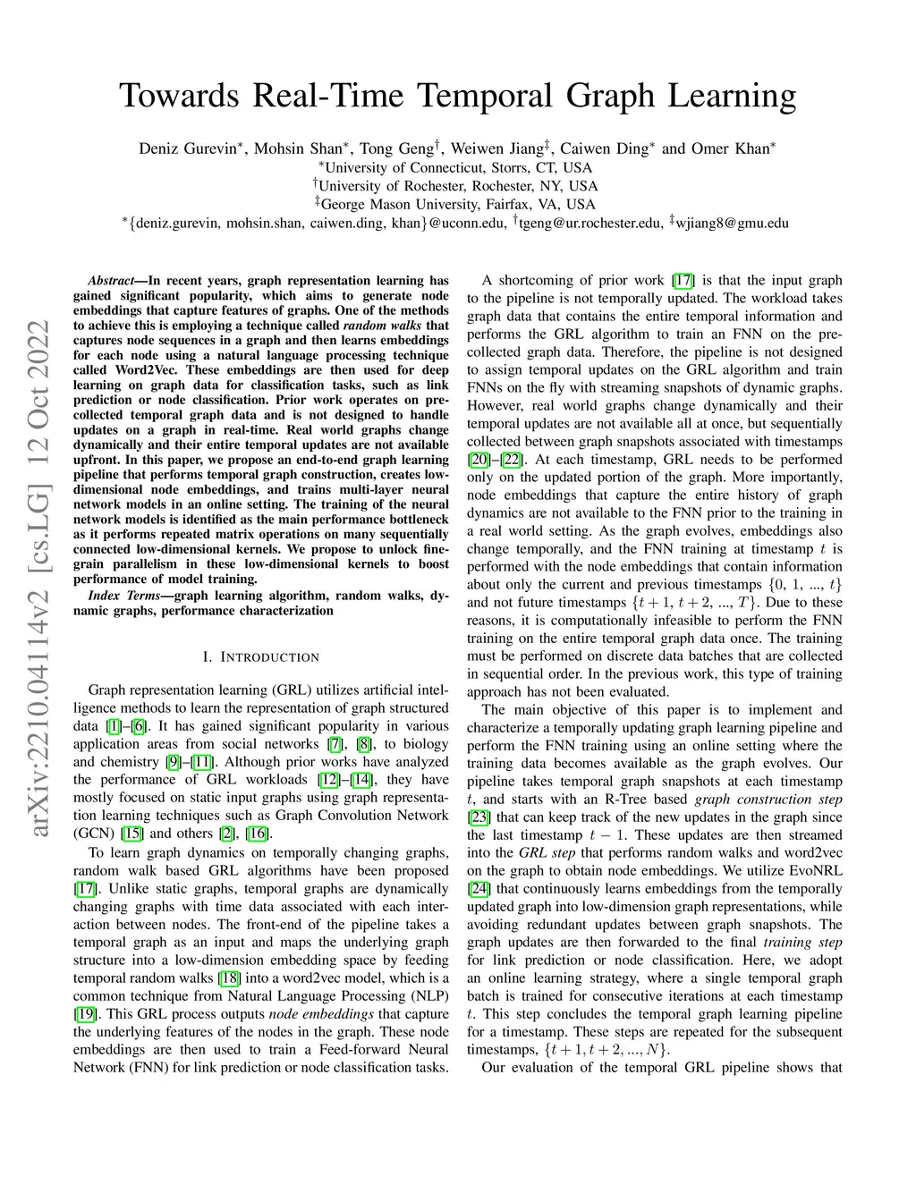 In recent years, graph representation learning has gained significant popularity, which aims to generate node embeddings that capture features of graphs. One of the methods to achieve this is employing a technique called random walks that captures node sequences in a graph and then learns embeddings for each node using a natural language processing technique called Word2Vec. These embeddings are then used for deep learning on graph data for classification tasks, such as link prediction or node classification. Prior work operates on pre-collected temporal graph data and is not designed to handle updates on a graph in real-time. Real world graphs change dynamically and their entire temporal updates are not available upfront. In this paper, we propose an end-to-end graph learning pipeline that performs temporal graph construction, creates low-dimensional node embeddings, and trains multi-layer neural network models in an online setting. The training of the neural network models is identified as the main performance bottleneck as it performs repeated matrix operations on many sequentially connected low-dimensional kernels. We propose to unlock fine-grain parallelism in these low-dimensional kernels to boost performance of model training.