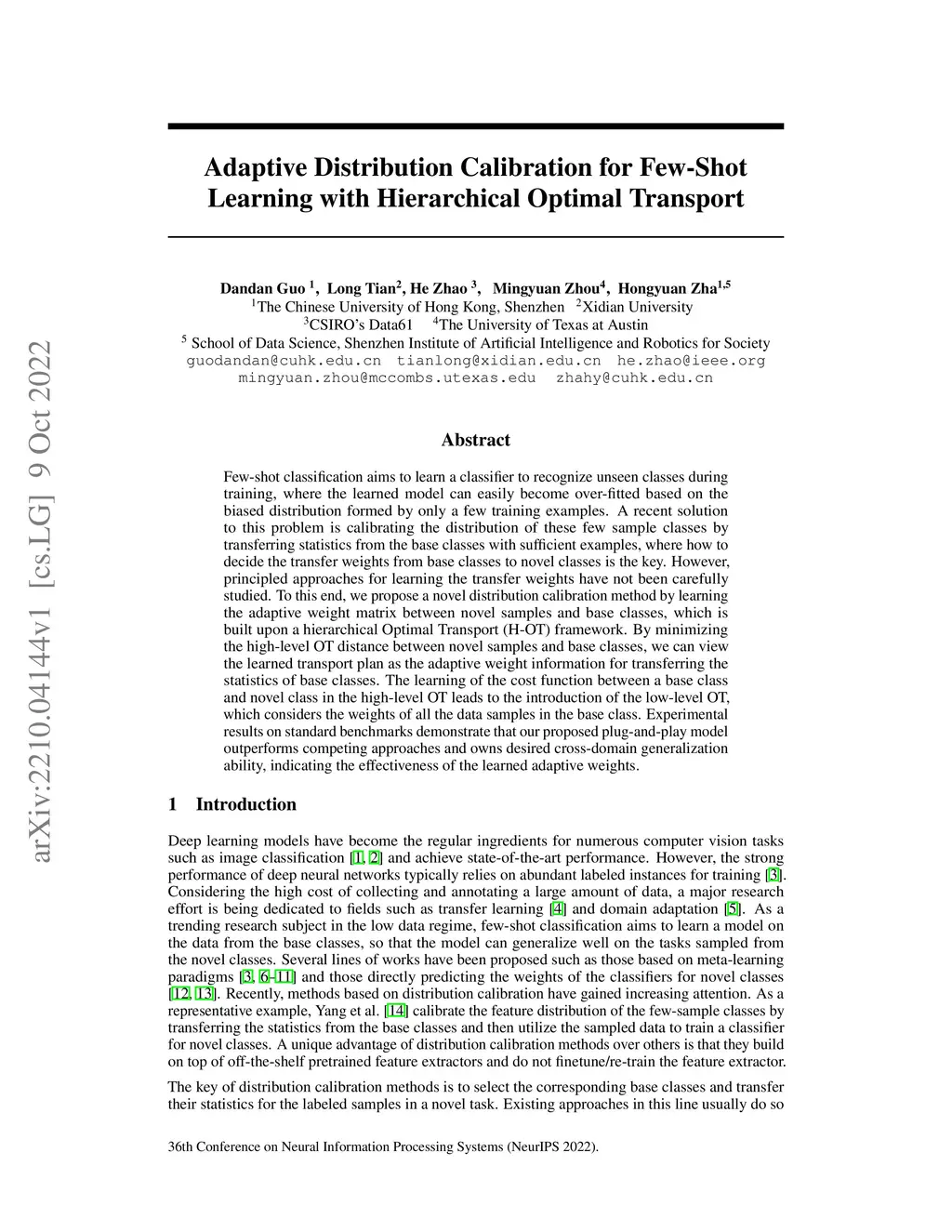 Few-shot classification aims to learn a classifier to recognize unseen classes during training, where the learned model can easily become over-fitted based on the biased distribution formed by only a few training examples. A recent solution to this problem is calibrating the distribution of these few sample classes by transferring statistics from the base classes with sufficient examples, where how to decide the transfer weights from base classes to novel classes is the key. However, principled approaches for learning the transfer weights have not been carefully studied. To this end, we propose a novel distribution calibration method by learning the adaptive weight matrix between novel samples and base classes, which is built upon a hierarchical Optimal Transport (H-OT) framework. By minimizing the high-level OT distance between novel samples and base classes, we can view the learned transport plan as the adaptive weight information for transferring the statistics of base classes. The learning of the cost function between a base class and novel class in the high-level OT leads to the introduction of the low-level OT, which considers the weights of all the data samples in the base class. Experimental results on standard benchmarks demonstrate that our proposed plug-and-play model outperforms competing approaches and owns desired cross-domain generalization ability, indicating the effectiveness of the learned adaptive weights.