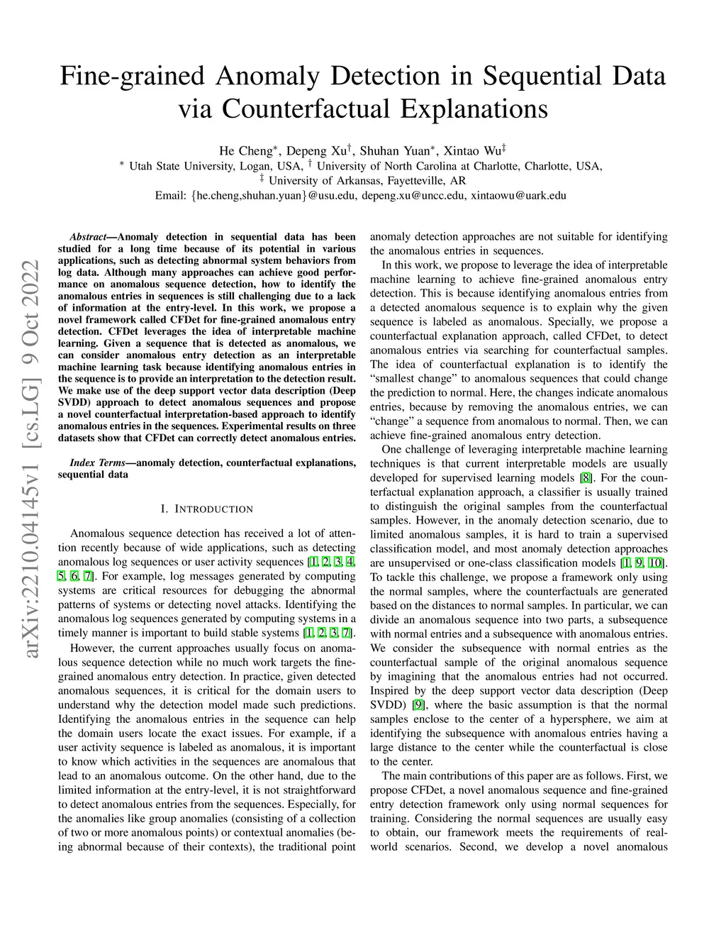 Anomaly detection in sequential data has been studied for a long time because of its potential in various applications, such as detecting abnormal system behaviors from log data. Although many approaches can achieve good performance on anomalous sequence detection, how to identify the anomalous entries in sequences is still challenging due to a lack of information at the entry-level. In this work, we propose a novel framework called CFDet for fine-grained anomalous entry detection. CFDet leverages the idea of interpretable machine learning. Given a sequence that is detected as anomalous, we can consider anomalous entry detection as an interpretable machine learning task because identifying anomalous entries in the sequence is to provide an interpretation to the detection result. We make use of the deep support vector data description (Deep SVDD) approach to detect anomalous sequences and propose a novel counterfactual interpretation-based approach to identify anomalous entries in the sequences. Experimental results on three datasets show that CFDet can correctly detect anomalous entries.