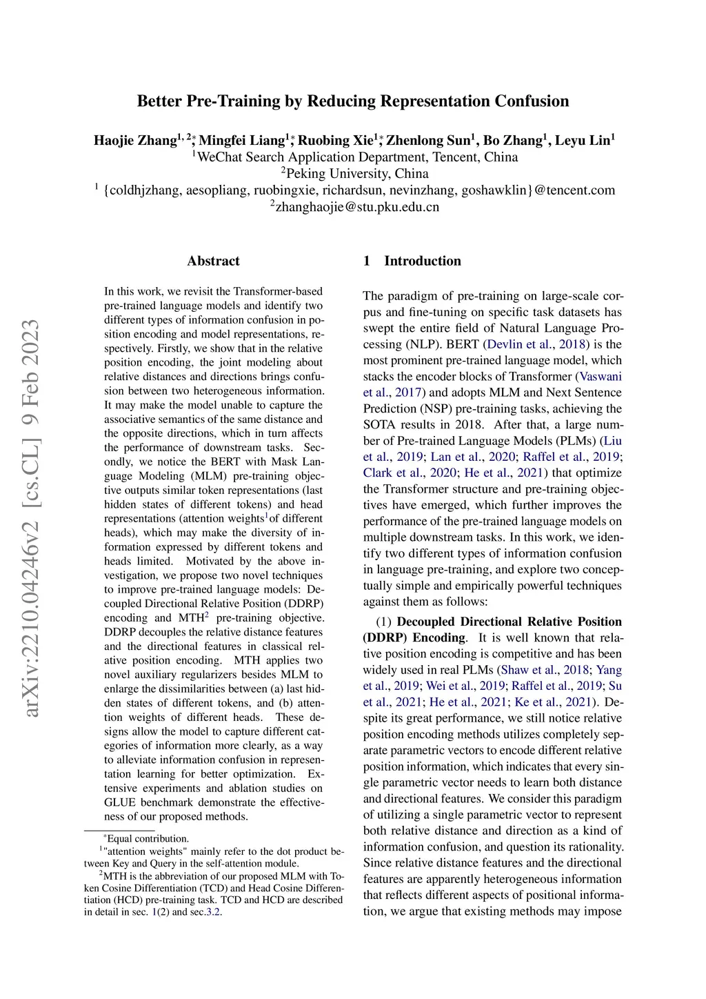 In this work, we revisit the Transformer-based pre-trained language models and identify two different types of information confusion in position encoding and model representations, respectively. Firstly, we show that in the relative position encoding, the joint modeling about relative distances and directions brings confusion between two heterogeneous information. It may make the model unable to capture the associative semantics of the same distance and the opposite directions, which in turn affects the performance of downstream tasks. Secondly, we notice the BERT with Mask Language Modeling (MLM) pre-training objective outputs similar token representations (last hidden states of different tokens) and head representations (attention weights of different heads), which may make the diversity of information expressed by different tokens and heads limited. Motivated by the above investigation, we propose two novel techniques to improve pre-trained language models: Decoupled Directional Relative Position (DDRP) encoding and MTH pre-training objective. DDRP decouples the relative distance features and the directional features in classical relative position encoding. MTH applies two novel auxiliary regularizers besides MLM to enlarge the dissimilarities between (a) last hidden states of different tokens, and (b) attention weights of different heads. These designs allow the model to capture different categories of information more clearly, as a way to alleviate information confusion in representation learning for better optimization. Extensive experiments and ablation studies on GLUE benchmark demonstrate the effectiveness of our proposed methods.