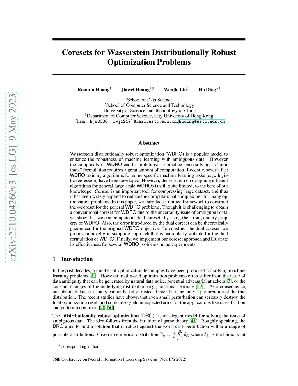 Wasserstein distributionally robust optimization (\textsf{WDRO}) is a popular model to enhance the robustness of machine learning with ambiguous data. However, the complexity of \textsf{WDRO} can be prohibitive in practice since solving its ``minimax'' formulation requires a great amount of computation. Recently, several fast \textsf{WDRO} training algorithms for some specific machine learning tasks (e.g., logistic regression) have been developed. However, the research on designing efficient algorithms for general large-scale \textsf{WDRO}s is still quite limited, to the best of our knowledge. \textit{Coreset} is an important tool for compressing large dataset, and thus it has been widely applied to reduce the computational complexities for many optimization problems. In this paper, we introduce a unified framework to construct the ϵ\epsilon-coreset for the general \textsf{WDRO} problems. Though it is challenging to obtain a conventional coreset for \textsf{WDRO} due to the uncertainty issue of ambiguous data, we show that we can compute a ``dual coreset'' by using the strong duality property of \textsf{WDRO}. Also, the error introduced by the dual coreset can be theoretically guaranteed for the original \textsf{WDRO} objective. To construct the dual coreset, we propose a novel grid sampling approach that is particularly suitable for the dual formulation of \textsf{WDRO}. Finally, we implement our coreset approach and illustrate its effectiveness for several \textsf{WDRO} problems in the experiments.