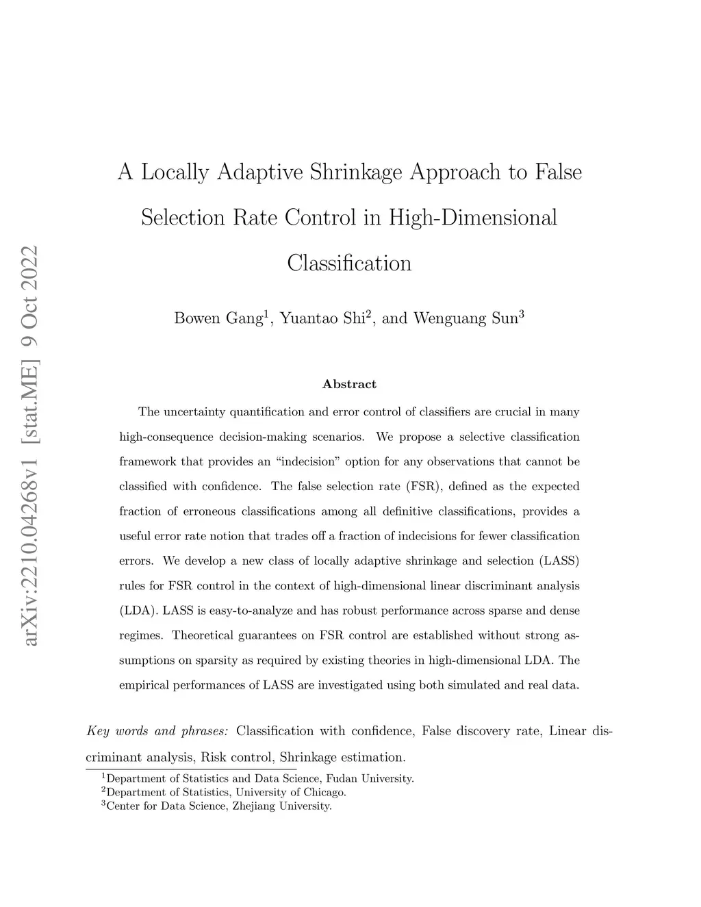 The uncertainty quantification and error control of classifiers are crucial in many high-consequence decision-making scenarios. We propose a selective classification framework that provides an indecision option for any observations that cannot be classified with confidence. The false selection rate (FSR), defined as the expected fraction of erroneous classifications among all definitive classifications, provides a useful error rate notion that trades off a fraction of indecisions for fewer classification errors. We develop a new class of locally adaptive shrinkage and selection (LASS) rules for FSR control in the context of high-dimensional linear discriminant analysis (LDA). LASS is easy-to-analyze and has robust performance across sparse and dense regimes. Theoretical guarantees on FSR control are established without strong assumptions on sparsity as required by existing theories in high-dimensional LDA. The empirical performances of LASS are investigated using both simulated and real data.