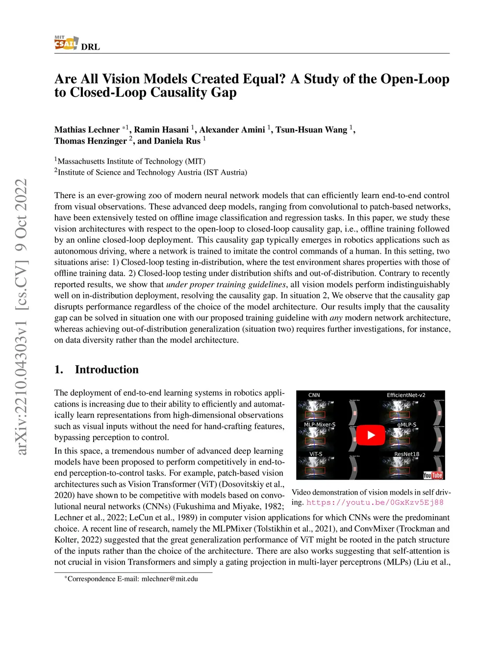 There is an ever-growing zoo of modern neural network models that can efficiently learn end-to-end control from visual observations. These advanced deep models, ranging from convolutional to patch-based networks, have been extensively tested on offline image classification and regression tasks. In this paper, we study these vision architectures with respect to the open-loop to closed-loop causality gap, i.e., offline training followed by an online closed-loop deployment. This causality gap typically emerges in robotics applications such as autonomous driving, where a network is trained to imitate the control commands of a human. In this setting, two situations arise: 1) Closed-loop testing in-distribution, where the test environment shares properties with those of offline training data. 2) Closed-loop testing under distribution shifts and out-of-distribution. Contrary to recently reported results, we show that under proper training guidelines, all vision models perform indistinguishably well on in-distribution deployment, resolving the causality gap. In situation 2, We observe that the causality gap disrupts performance regardless of the choice of the model architecture. Our results imply that the causality gap can be solved in situation one with our proposed training guideline with any modern network architecture, whereas achieving out-of-distribution generalization (situation two) requires further investigations, for instance, on data diversity rather than the model architecture.