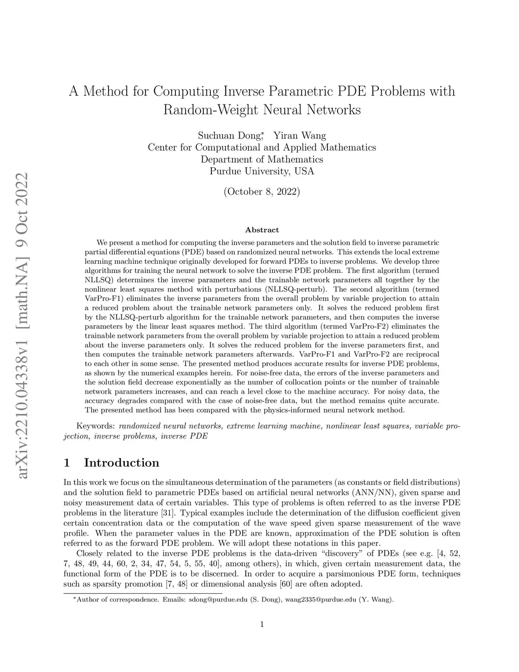 We present a method for computing the inverse parameters and the solution field to inverse parametric PDEs based on randomized neural networks. This extends the local extreme learning machine technique originally developed for forward PDEs to inverse problems. We develop three algorithms for training the neural network to solve the inverse PDE problem. The first algorithm (NLLSQ) determines the inverse parameters and the trainable network parameters all together by the nonlinear least squares method with perturbations (NLLSQ-perturb). The second algorithm (VarPro-F1) eliminates the inverse parameters from the overall problem by variable projection to attain a reduced problem about the trainable network parameters only. It solves the reduced problem first by the NLLSQ-perturb algorithm for the trainable network parameters, and then computes the inverse parameters by the linear least squares method. The third algorithm (VarPro-F2) eliminates the trainable network parameters from the overall problem by variable projection to attain a reduced problem about the inverse parameters only. It solves the reduced problem for the inverse parameters first, and then computes the trainable network parameters afterwards. VarPro-F1 and VarPro-F2 are reciprocal to each other in a sense. The presented method produces accurate results for inverse PDE problems, as shown by the numerical examples herein. For noise-free data, the errors for the inverse parameters and the solution field decrease exponentially as the number of collocation points or the number of trainable network parameters increases, and can reach a level close to the machine accuracy. For noisy data, the accuracy degrades compared with the case of noise-free data, but the method remains quite accurate. The presented method has been compared with the physics-informed neural network method.