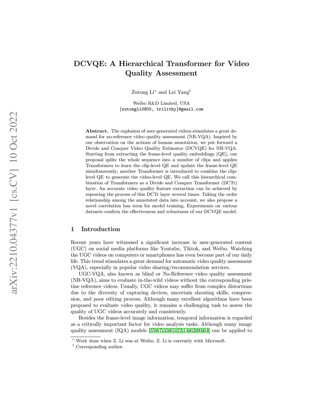 The explosion of user-generated videos stimulates a great demand for no-reference video quality assessment (NR-VQA). Inspired by our observation on the actions of human annotation, we put forward a Divide and Conquer Video Quality Estimator (DCVQE) for NR-VQA. Starting from extracting the frame-level quality embeddings (QE), our proposal splits the whole sequence into a number of clips and applies Transformers to learn the clip-level QE and update the frame-level QE simultaneously; another Transformer is introduced to combine the clip-level QE to generate the video-level QE. We call this hierarchical combination of Transformers as a Divide and Conquer Transformer (DCTr) layer. An accurate video quality feature extraction can be achieved by repeating the process of this DCTr layer several times. Taking the order relationship among the annotated data into account, we also propose a novel correlation loss term for model training. Experiments on various datasets confirm the effectiveness and robustness of our DCVQE model.