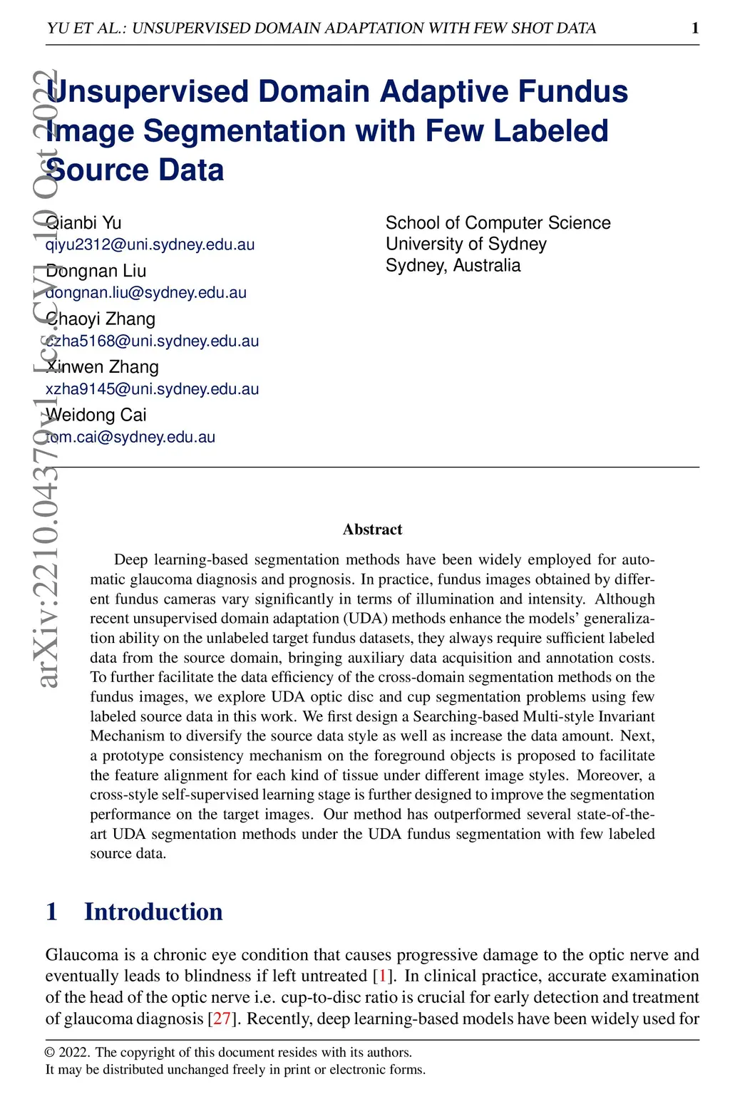 Deep learning-based segmentation methods have been widely employed for automatic glaucoma diagnosis and prognosis. In practice, fundus images obtained by different fundus cameras vary significantly in terms of illumination and intensity. Although recent unsupervised domain adaptation (UDA) methods enhance the models' generalization ability on the unlabeled target fundus datasets, they always require sufficient labeled data from the source domain, bringing auxiliary data acquisition and annotation costs. To further facilitate the data efficiency of the cross-domain segmentation methods on the fundus images, we explore UDA optic disc and cup segmentation problems using few labeled source data in this work. We first design a Searching-based Multi-style Invariant Mechanism to diversify the source data style as well as increase the data amount. Next, a prototype consistency mechanism on the foreground objects is proposed to facilitate the feature alignment for each kind of tissue under different image styles. Moreover, a cross-style self-supervised learning stage is further designed to improve the segmentation performance on the target images. Our method has outperformed several state-of-the-art UDA segmentation methods under the UDA fundus segmentation with few labeled source data.