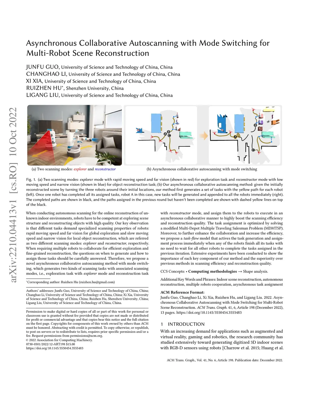 When conducting autonomous scanning for the online reconstruction of unknown indoor environments, robots have to be competent at exploring scene structure and reconstructing objects with high quality. Our key observation is that different tasks demand specialized scanning properties of robots: rapid moving speed and far vision for global exploration and slow moving speed and narrow vision for local object reconstruction, which are referred as two different scanning modes: explorer and reconstructor, respectively. When requiring multiple robots to collaborate for efficient exploration and fine-grained reconstruction, the questions on when to generate and how to assign those tasks should be carefully answered. Therefore, we propose a novel asynchronous collaborative autoscanning method with mode switching, which generates two kinds of scanning tasks with associated scanning modes, i.e., exploration task with explorer mode and reconstruction task with reconstructor mode, and assign them to the robots to execute in an asynchronous collaborative manner to highly boost the scanning efficiency and reconstruction quality. The task assignment is optimized by solving a modified Multi-Depot Multiple Traveling Salesman Problem (MDMTSP). Moreover, to further enhance the collaboration and increase the efficiency, we propose a task-flow model that actives the task generation and assignment process immediately when any of the robots finish all its tasks with no need to wait for all other robots to complete the tasks assigned in the previous iteration. Extensive experiments have been conducted to show the importance of each key component of our method and the superiority over previous methods in scanning efficiency and reconstruction quality.