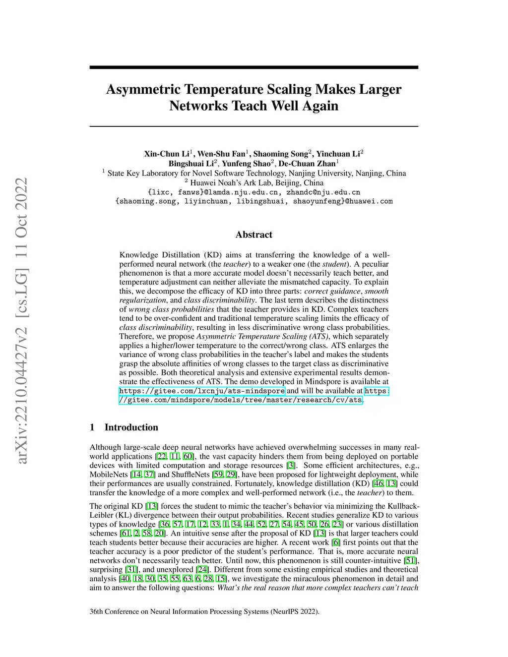 Knowledge Distillation (KD) aims at transferring the knowledge of a well-performed neural network (the {\it teacher}) to a weaker one (the {\it student}). A peculiar phenomenon is that a more accurate model doesn't necessarily teach better, and temperature adjustment can neither alleviate the mismatched capacity. To explain this, we decompose the efficacy of KD into three parts: {\it correct guidance}, {\it smooth regularization}, and {\it class discriminability}. The last term describes the distinctness of {\it wrong class probabilities} that the teacher provides in KD. Complex teachers tend to be over-confident and traditional temperature scaling limits the efficacy of {\it class discriminability}, resulting in less discriminative wrong class probabilities. Therefore, we propose {\it Asymmetric Temperature Scaling (ATS)}, which separately applies a higher/lower temperature to the correct/wrong class. ATS enlarges the variance of wrong class probabilities in the teacher's label and makes the students grasp the absolute affinities of wrong classes to the target class as discriminative as possible. Both theoretical analysis and extensive experimental results demonstrate the effectiveness of ATS. The demo developed in Mindspore is available at https://gitee.com/lxcnju/ats-mindspore and will be available at https://gitee.com/mindspore/models/tree/master/research/cv/ats.