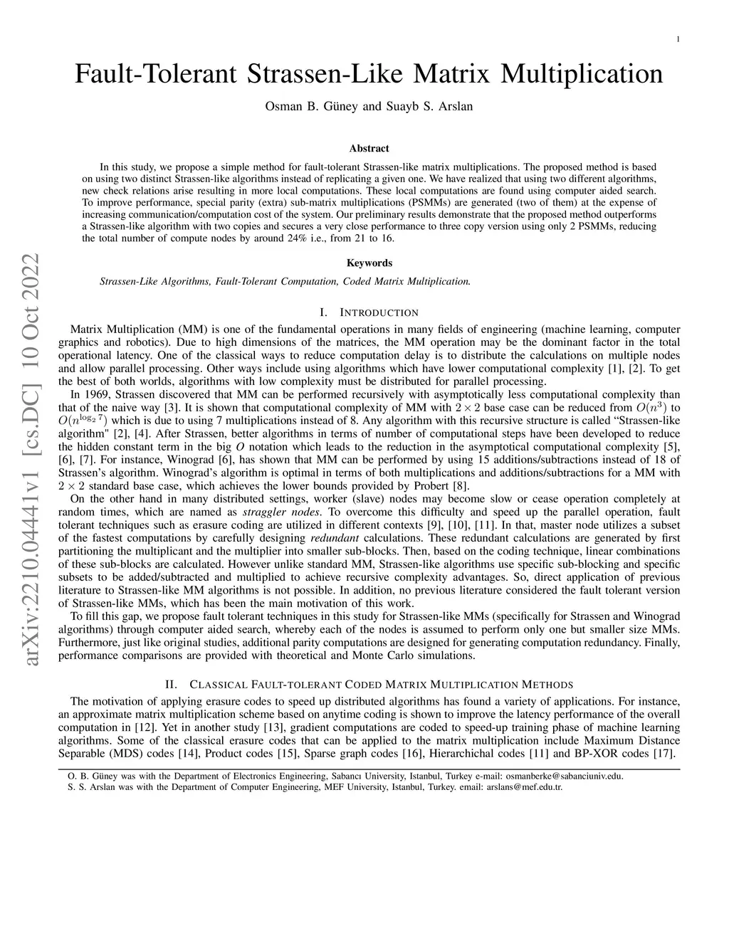 In this study, we propose a simple method for fault-tolerant Strassen-like matrix multiplications. The proposed method is based on using two distinct Strassen-like algorithms instead of replicating a given one. We have realized that using two different algorithms, new check relations arise resulting in more local computations. These local computations are found using computer aided search. To improve performance, special parity (extra) sub-matrix multiplications (PSMMs) are generated (two of them) at the expense of increasing communication/computation cost of the system. Our preliminary results demonstrate that the proposed method outperforms a Strassen-like algorithm with two copies and secures a very close performance to three copy version using only 2 PSMMs, reducing the total number of compute nodes by around 24\% i.e., from 21 to 16.