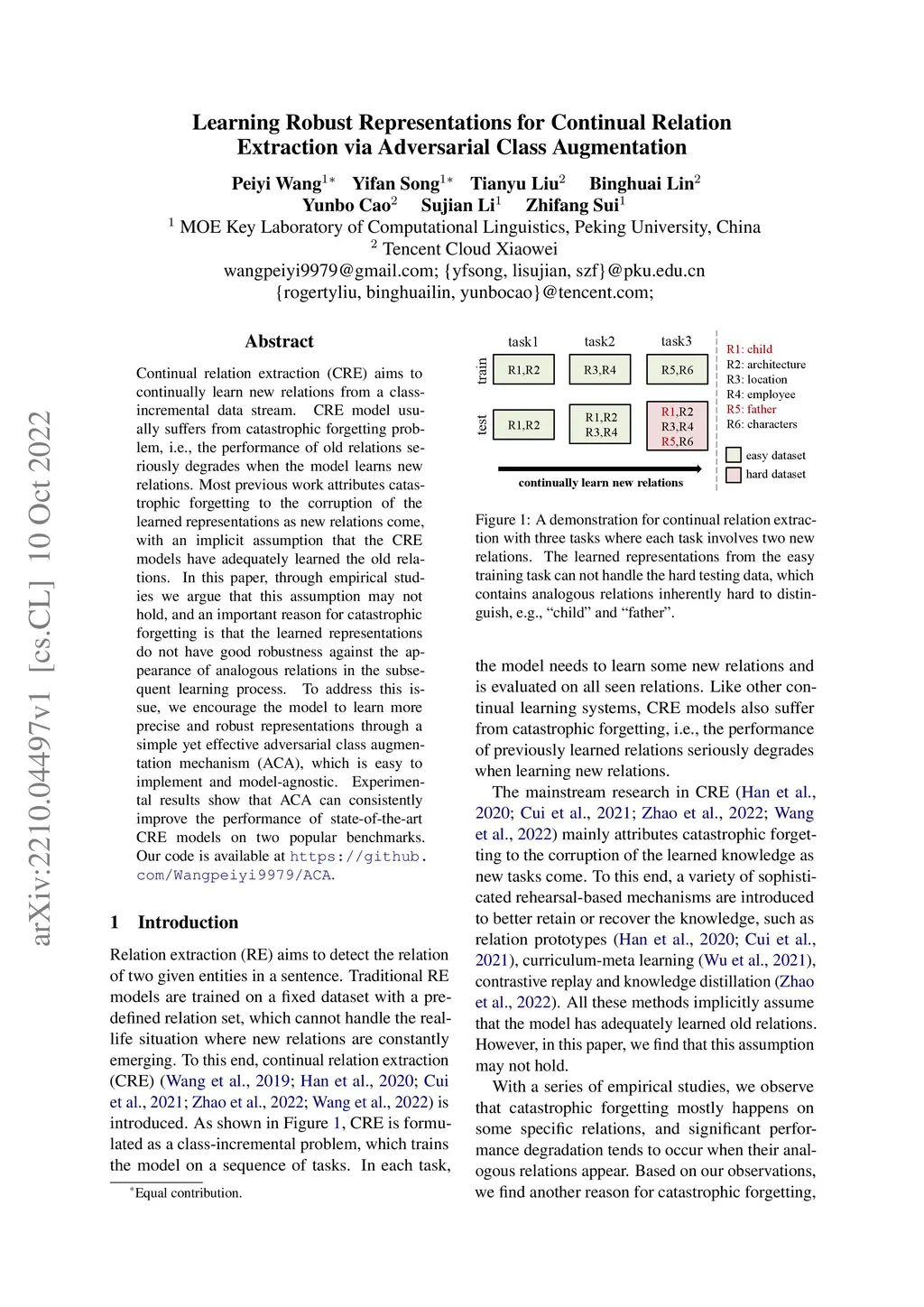 Continual relation extraction (CRE) aims to continually learn new relations from a class-incremental data stream. CRE model usually suffers from catastrophic forgetting problem, i.e., the performance of old relations seriously degrades when the model learns new relations. Most previous work attributes catastrophic forgetting to the corruption of the learned representations as new relations come, with an implicit assumption that the CRE models have adequately learned the old relations. In this paper, through empirical studies we argue that this assumption may not hold, and an important reason for catastrophic forgetting is that the learned representations do not have good robustness against the appearance of analogous relations in the subsequent learning process. To address this issue, we encourage the model to learn more precise and robust representations through a simple yet effective adversarial class augmentation mechanism (ACA), which is easy to implement and model-agnostic. Experimental results show that ACA can consistently improve the performance of state-of-the-art CRE models on two popular benchmarks.