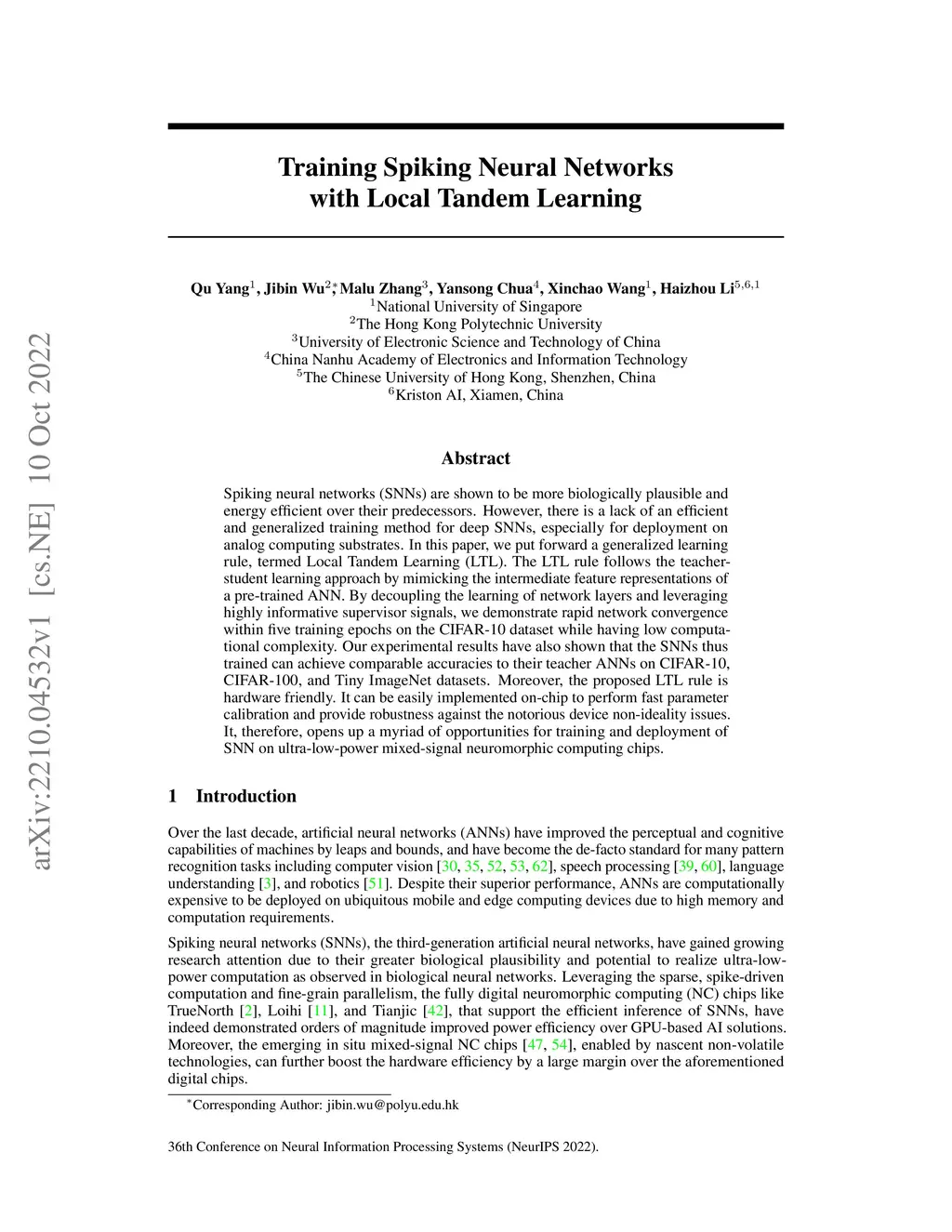 Training Spiking Neural Networks with Local Tandem Learning