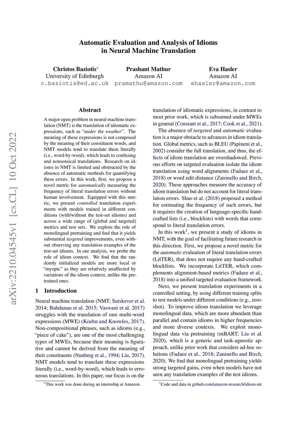 A major open problem in neural machine translation (NMT) is the translation of idiomatic expressions, such as "under the weather". The meaning of these expressions is not composed by the meaning of their constituent words, and NMT models tend to translate them literally (i.e., word-by-word), which leads to confusing and nonsensical translations. Research on idioms in NMT is limited and obstructed by the absence of automatic methods for quantifying these errors. In this work, first, we propose a novel metric for automatically measuring the frequency of literal translation errors without human involvement. Equipped with this metric, we present controlled translation experiments with models trained in different conditions (with/without the test-set idioms) and across a wide range of (global and targeted) metrics and test sets. We explore the role of monolingual pretraining and find that it yields substantial targeted improvements, even without observing any translation examples of the test-set idioms. In our analysis, we probe the role of idiom context. We find that the randomly initialized models are more local or "myopic" as they are relatively unaffected by variations of the idiom context, unlike the pretrained ones.