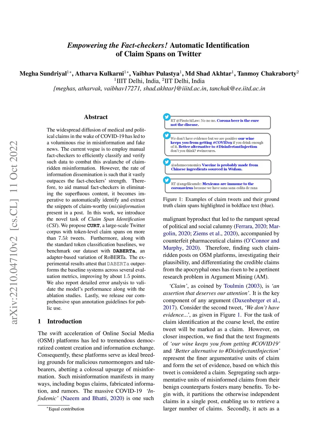 The widespread diffusion of medical and political claims in the wake of COVID-19 has led to a voluminous rise in misinformation and fake news. The current vogue is to employ manual fact-checkers to efficiently classify and verify such data to combat this avalanche of claim-ridden misinformation. However, the rate of information dissemination is such that it vastly outpaces the fact-checkers' strength. Therefore, to aid manual fact-checkers in eliminating the superfluous content, it becomes imperative to automatically identify and extract the snippets of claim-worthy (mis)information present in a post. In this work, we introduce the novel task of Claim Span Identification (CSI). We propose CURT, a large-scale Twitter corpus with token-level claim spans on more than 7.5k tweets. Furthermore, along with the standard token classification baselines, we benchmark our dataset with DABERTa, an adapter-based variation of RoBERTa. The experimental results attest that DABERTa outperforms the baseline systems across several evaluation metrics, improving by about 1.5 points. We also report detailed error analysis to validate the model's performance along with the ablation studies. Lastly, we release our comprehensive span annotation guidelines for public use.