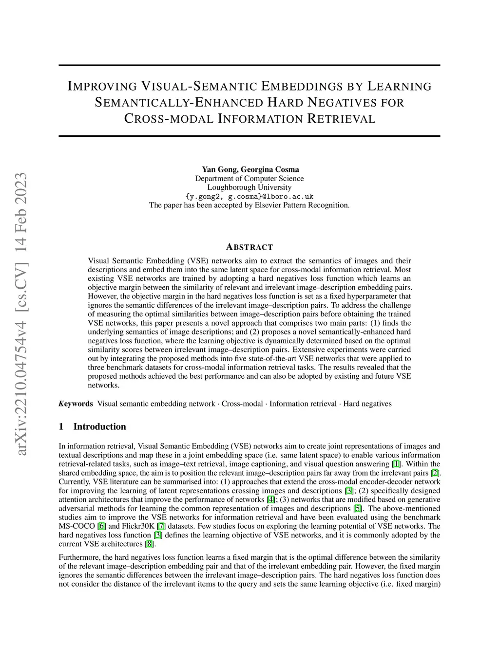 Visual Semantic Embedding (VSE) aims to extract the semantics of images and their descriptions, and embed them into the same latent space for cross-modal information retrieval. Most existing VSE networks are trained by adopting a hard negatives loss function which learns an objective margin between the similarity of relevant and irrelevant image-description embedding pairs. However, the objective margin in the hard negatives loss function is set as a fixed hyperparameter that ignores the semantic differences of the irrelevant image-description pairs. To address the challenge of measuring the optimal similarities between image-description pairs before obtaining the trained VSE networks, this paper presents a novel approach that comprises two main parts: (1) finds the underlying semantics of image descriptions; and (2) proposes a novel semantically enhanced hard negatives loss function, where the learning objective is dynamically determined based on the optimal similarity scores between irrelevant image-description pairs. Extensive experiments were carried out by integrating the proposed methods into five state-of-the-art VSE networks that were applied to three benchmark datasets for cross-modal information retrieval tasks. The results revealed that the proposed methods achieved the best performance and can also be adopted by existing and future VSE networks.