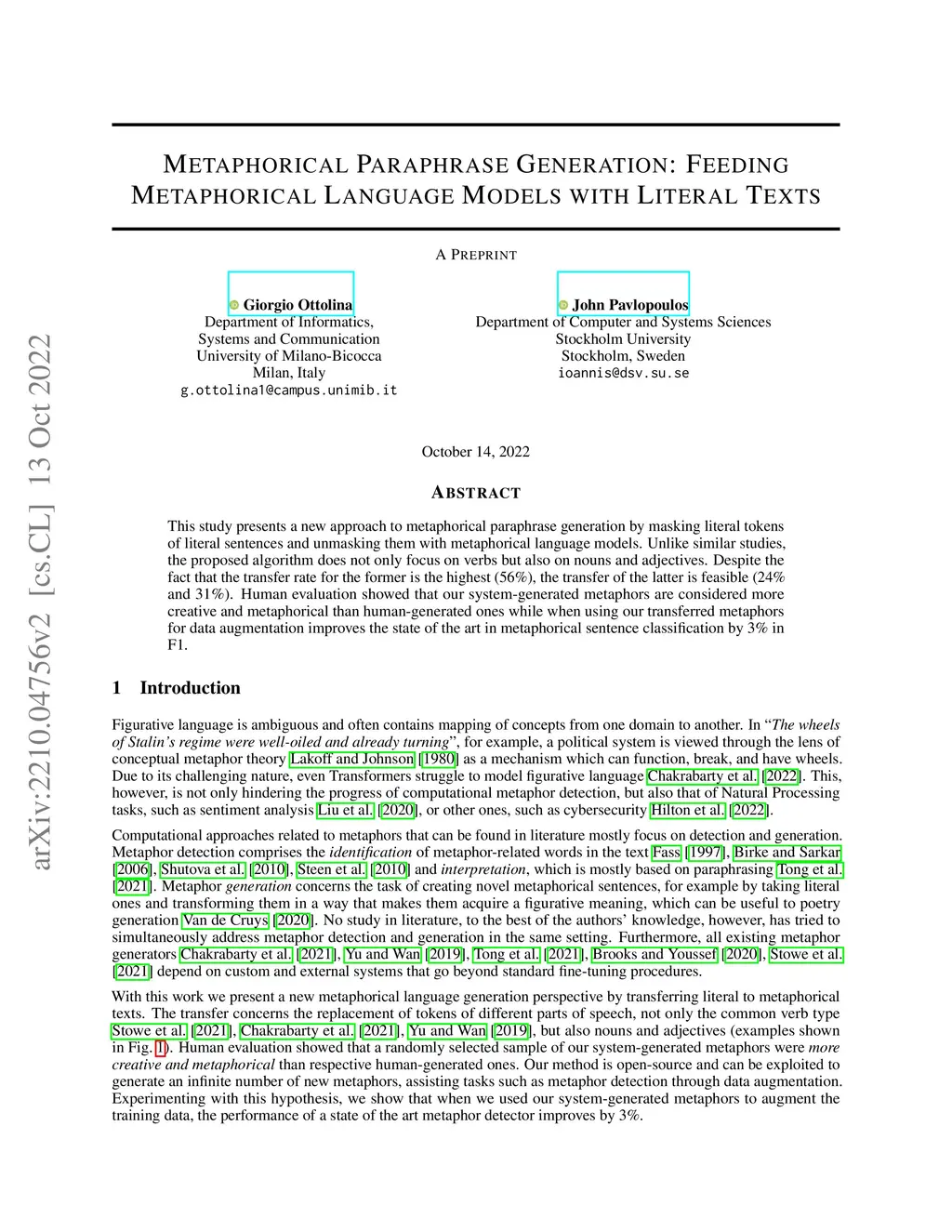 This study presents a new approach to metaphorical paraphrase generation by masking literal tokens of literal sentences and unmasking them with metaphorical language models. Unlike similar studies, the proposed algorithm does not only focus on verbs but also on nouns and adjectives. Despite the fact that the transfer rate for the former is the highest (56%), the transfer of the latter is feasible (24% and 31%). Human evaluation showed that our system-generated metaphors are considered more creative and metaphorical than human-generated ones while when using our transferred metaphors for data augmentation improves the state of the art in metaphorical sentence classification by 3% in F1.