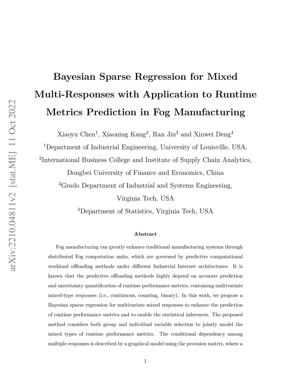 Fog manufacturing can greatly enhance traditional manufacturing systems through distributed Fog computation units, which are governed by predictive computational workload offloading methods under different Industrial Internet architectures. It is known that the predictive offloading methods highly depend on accurate prediction and uncertainty quantification of runtime performance metrics, containing multivariate mixed-type responses (i.e., continuous, counting, binary). In this work, we propose a Bayesian sparse regression for multivariate mixed responses to enhance the prediction of runtime performance metrics and to enable the statistical inferences. The proposed method considers both group and individual variable selection to jointly model the mixed types of runtime performance metrics. The conditional dependency among multiple responses is described by a graphical model using the precision matrix, where a spike-and-slab prior is used to enable the sparse estimation of the graph. The proposed method not only achieves accurate prediction, but also makes the predictive model more interpretable with statistical inferences on model parameters and prediction in the Fog manufacturing. A simulation study and a real case example in a Fog manufacturing are conducted to demonstrate the merits of the proposed model.