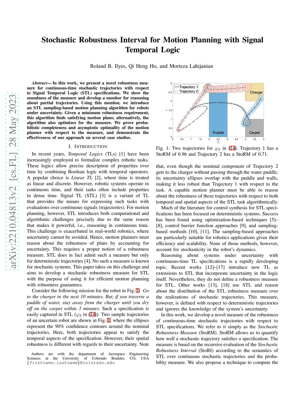 In this work, we present a novel robustness measure for continuous-time stochastic trajectories with respect to Signal Temporal Logic (STL) specifications. We show the soundness of the measure and develop a monitor for reasoning about partial trajectories. Using this monitor, we introduce an STL sampling-based motion planning algorithm for robots under uncertainty. Given a minimum robustness requirement, this algorithm finds satisfying motion plans; alternatively, the algorithm also optimizes for the measure. We prove probabilistic completeness and asymptotic optimality, and demonstrate the effectiveness of our approach on several case studies.