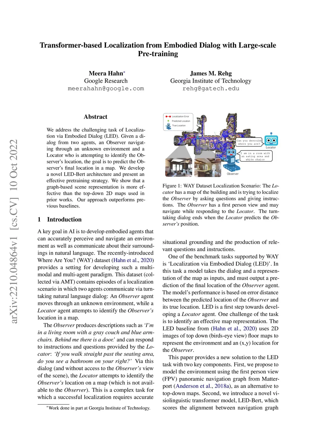 We address the challenging task of Localization via Embodied Dialog (LED). Given a dialog from two agents, an Observer navigating through an unknown environment and a Locator who is attempting to identify the Observer's location, the goal is to predict the Observer's final location in a map. We develop a novel LED-Bert architecture and present an effective pretraining strategy. We show that a graph-based scene representation is more effective than the top-down 2D maps used in prior works. Our approach outperforms previous baselines.