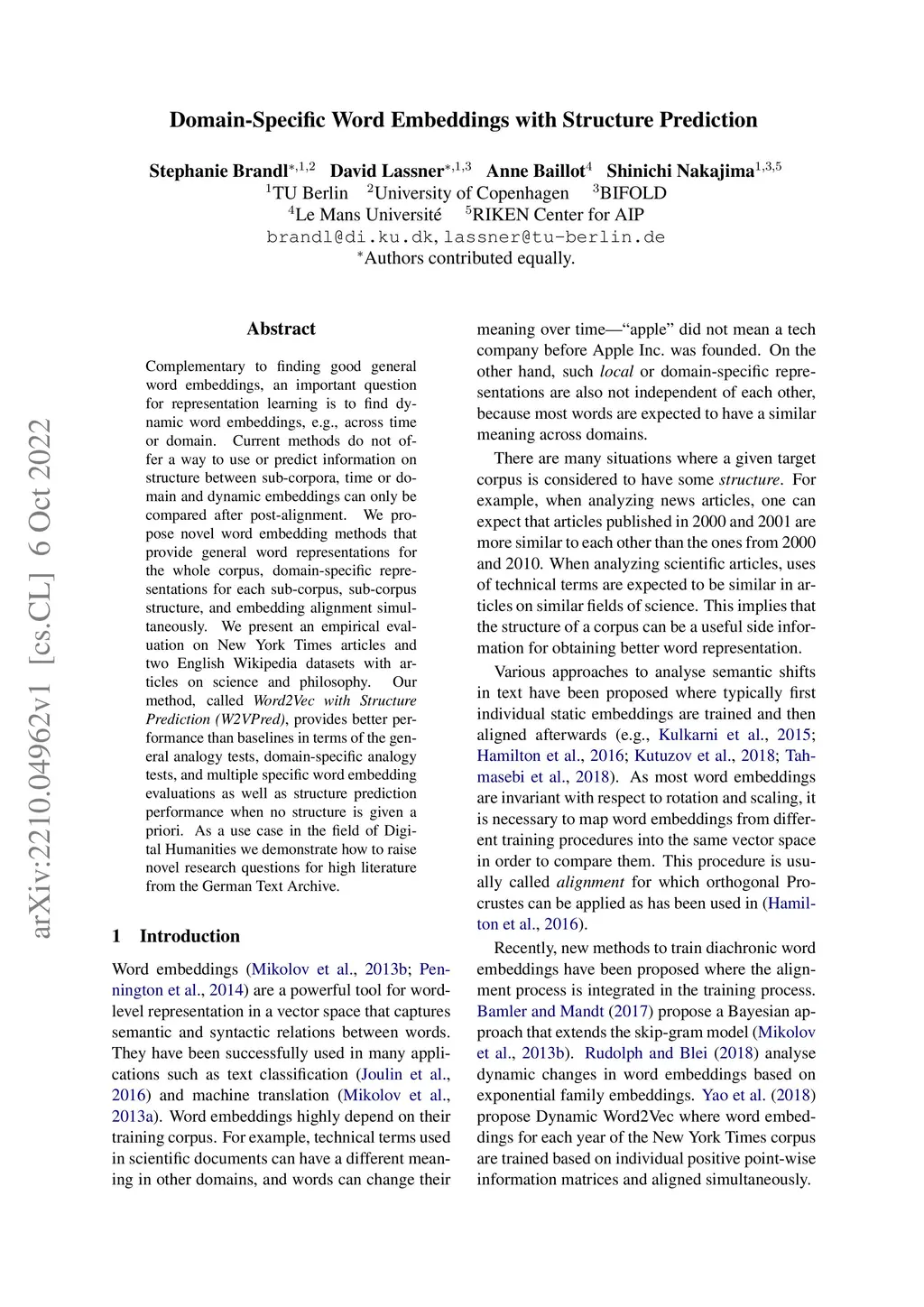Complementary to finding good general word embeddings, an important question for representation learning is to find dynamic word embeddings, e.g., across time or domain. Current methods do not offer a way to use or predict information on structure between sub-corpora, time or domain and dynamic embeddings can only be compared after post-alignment. We propose novel word embedding methods that provide general word representations for the whole corpus, domain-specific representations for each sub-corpus, sub-corpus structure, and embedding alignment simultaneously. We present an empirical evaluation on New York Times articles and two English Wikipedia datasets with articles on science and philosophy. Our method, called Word2Vec with Structure Prediction (W2VPred), provides better performance than baselines in terms of the general analogy tests, domain-specific analogy tests, and multiple specific word embedding evaluations as well as structure prediction performance when no structure is given a priori. As a use case in the field of Digital Humanities we demonstrate how to raise novel research questions for high literature from the German Text Archive.