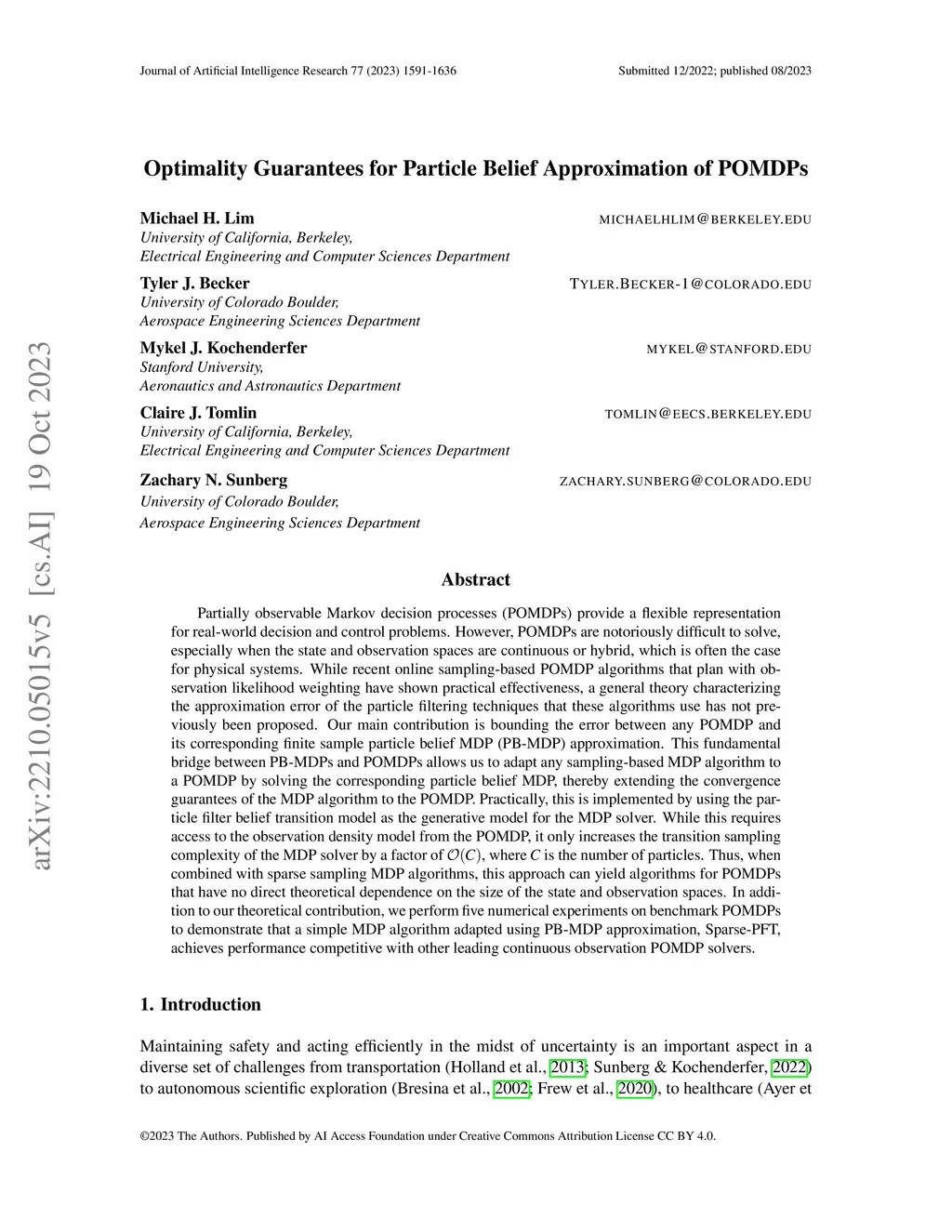 Partially observable Markov decision processes (POMDPs) provide a flexible representation for real-world decision and control problems. However, POMDPs are notoriously difficult to solve, especially when the state and observation spaces are continuous or hybrid, which is often the case for physical systems. While recent online sampling-based POMDP algorithms that plan with observation likelihood weighting have shown practical effectiveness, a general theory characterizing the approximation error of the particle filtering techniques that these algorithms use has not previously been proposed. Our main contribution is bounding the error between any POMDP and its corresponding finite sample particle belief MDP (PB-MDP) approximation. This fundamental bridge between PB-MDPs and POMDPs allows us to adapt any sampling-based MDP algorithm to a POMDP by solving the corresponding particle belief MDP, thereby extending the convergence guarantees of the MDP algorithm to the POMDP. Practically, this is implemented by using the particle filter belief transition model as the generative model for the MDP solver. While this requires access to the observation density model from the POMDP, it only increases the transition sampling complexity of the MDP solver by a factor of , where is the number of particles. Thus, when combined with sparse sampling MDP algorithms, this approach can yield algorithms for POMDPs that have no direct theoretical dependence on the size of the state and observation spaces. In addition to our theoretical contribution, we perform five numerical experiments on benchmark POMDPs to demonstrate that a simple MDP algorithm adapted using PB-MDP approximation, Sparse-PFT, achieves performance competitive with other leading continuous observation POMDP solvers.