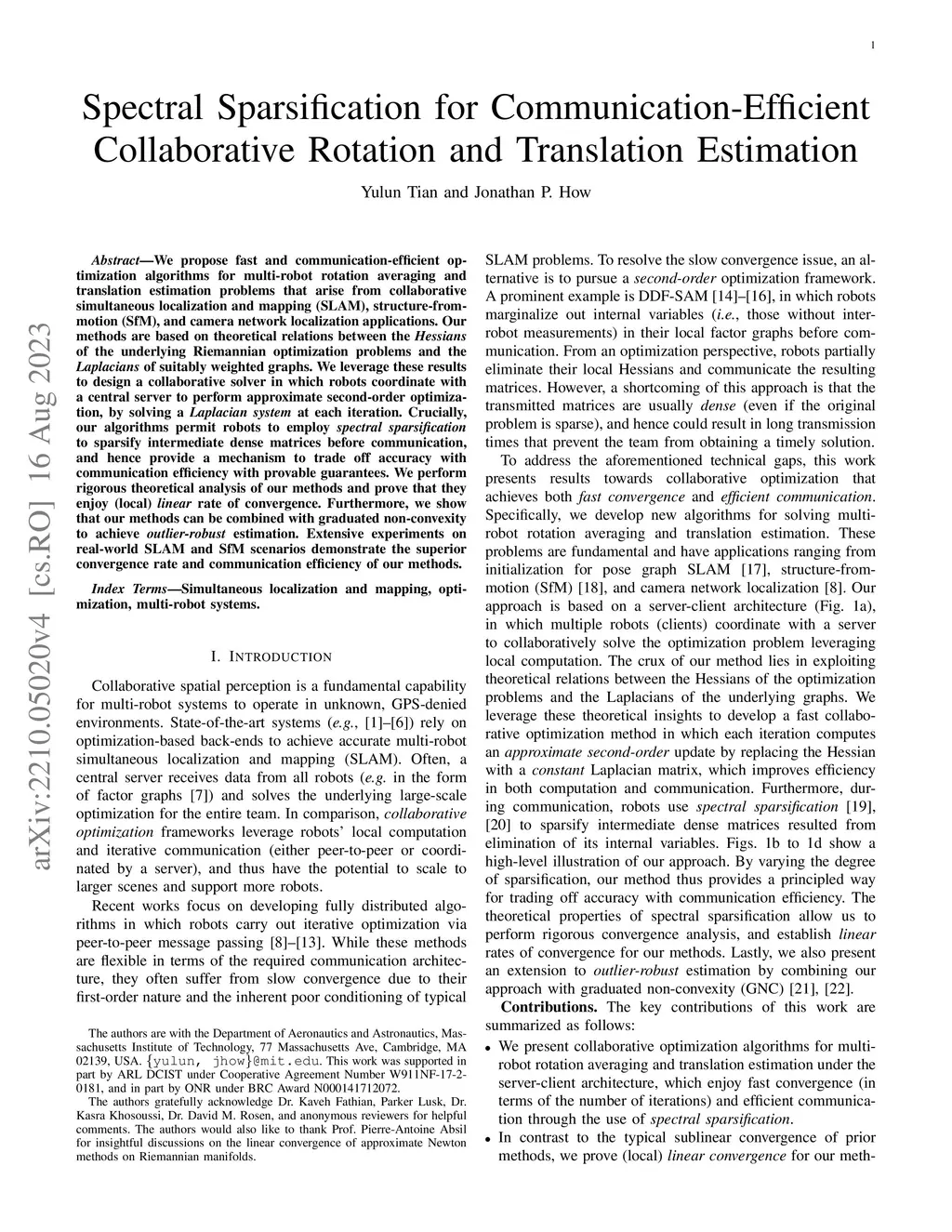 We propose fast and communication-efficient optimization algorithms for multi-robot rotation averaging and translation estimation problems that arise from collaborative simultaneous localization and mapping (SLAM), structure-from-motion (SfM), and camera network localization applications. Our methods are based on theoretical relations between the Hessians of the underlying Riemannian optimization problems and the Laplacians of suitably weighted graphs. We leverage these results to design a collaborative solver in which robots coordinate with a central server to perform approximate second-order optimization, by solving a Laplacian system at each iteration. Crucially, our algorithms permit robots to employ spectral sparsification to sparsify intermediate dense matrices before communication, and hence provide a mechanism to trade off accuracy with communication efficiency with provable guarantees. We perform rigorous theoretical analysis of our methods and prove that they enjoy (local) linear rate of convergence. Furthermore, we show that our methods can be combined with graduated non-convexity to achieve outlier-robust estimation. Extensive experiments on real-world SLAM and SfM scenarios demonstrate the superior convergence rate and communication efficiency of our methods.