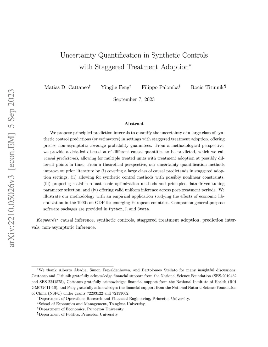 We propose principled prediction intervals to quantify the uncertainty of a large class of synthetic control predictions (or estimators) in settings with staggered treatment adoption, offering precise non-asymptotic coverage probability guarantees. From a methodological perspective, we provide a detailed discussion of different causal quantities to be predicted, which we call `causal predictands', allowing for multiple treated units with treatment adoption at possibly different points in time. From a theoretical perspective, our uncertainty quantification methods improve on prior literature by (i) covering a large class of causal predictands in staggered adoption settings, (ii) allowing for synthetic control methods with possibly nonlinear constraints, (iii) proposing scalable robust conic optimization methods and principled data-driven tuning parameter selection, and (iv) offering valid uniform inference across post-treatment periods. We illustrate our methodology with an empirical application studying the effects of economic liberalization in the 1990s on GDP for emerging European countries. Companion general-purpose software packages are provided in Python, R and Stata.