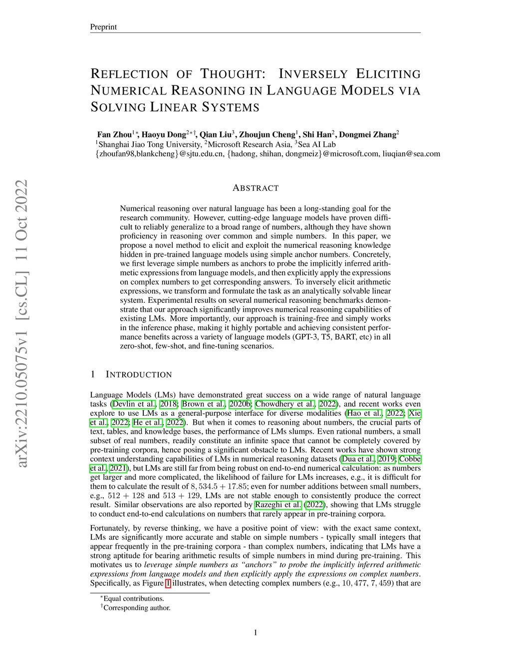 Numerical reasoning over natural language has been a long-standing goal for the research community. However, cutting-edge language models have proven difficult to reliably generalize to a broad range of numbers, although they have shown proficiency in reasoning over common and simple numbers. In this paper, we propose a novel method to elicit and exploit the numerical reasoning knowledge hidden in pre-trained language models using simple anchor numbers. Concretely, we first leverage simple numbers as anchors to probe the implicitly inferred arithmetic expressions from language models, and then explicitly apply the expressions on complex numbers to get corresponding answers. To inversely elicit arithmetic expressions, we transform and formulate the task as an analytically solvable linear system. Experimental results on several numerical reasoning benchmarks demonstrate that our approach significantly improves numerical reasoning capabilities of existing LMs. More importantly, our approach is training-free and simply works in the inference phase, making it highly portable and achieving consistent performance benefits across a variety of language models (GPT-3, T5, BART, etc) in all zero-shot, few-shot, and fine-tuning scenarios.