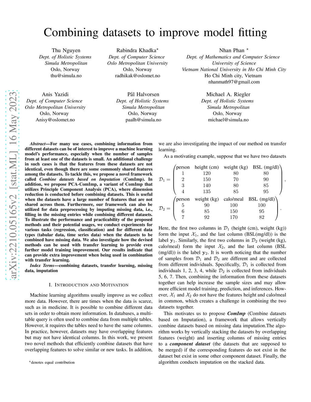 For many use cases, combining information from different datasets can be of interest to improve a machine learning model's performance, especially when the number of samples from at least one of the datasets is small. However, a potential challenge in such cases is that the features from these datasets are not identical, even though there are some commonly shared features among the datasets. To tackle this challenge, we propose a novel framework called Combine datasets based on Imputation (ComImp). In addition, we propose a variant of ComImp that uses Principle Component Analysis (PCA), PCA-ComImp in order to reduce dimension before combining datasets. This is useful when the datasets have a large number of features that are not shared between them. Furthermore, our framework can also be utilized for data preprocessing by imputing missing data, i.e., filling in the missing entries while combining different datasets. To illustrate the power of the proposed methods and their potential usages, we conduct experiments for various tasks: regression, classification, and for different data types: tabular data, time series data, when the datasets to be combined have missing data. We also investigate how the devised methods can be used with transfer learning to provide even further model training improvement. Our results indicate that the proposed methods are somewhat similar to transfer learning in that the merge can significantly improve the accuracy of a prediction model on smaller datasets. In addition, the methods can boost performance by a significant margin when combining small datasets together and can provide extra improvement when being used with transfer learning.
