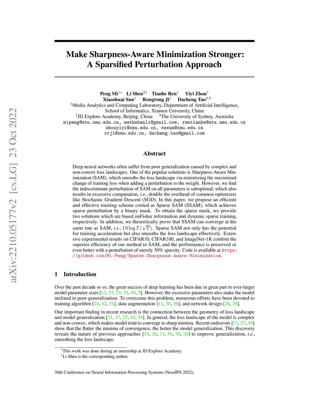 Deep neural networks often suffer from poor generalization caused by complex and non-convex loss landscapes. One of the popular solutions is Sharpness-Aware Minimization (SAM), which smooths the loss landscape via minimizing the maximized change of training loss when adding a perturbation to the weight. However, we find the indiscriminate perturbation of SAM on all parameters is suboptimal, which also results in excessive computation, i.e., double the overhead of common optimizers like Stochastic Gradient Descent (SGD). In this paper, we propose an efficient and effective training scheme coined as Sparse SAM (SSAM), which achieves sparse perturbation by a binary mask. To obtain the sparse mask, we provide two solutions which are based onFisher information and dynamic sparse training, respectively. In addition, we theoretically prove that SSAM can converge at the same rate as SAM, i.e., . Sparse SAM not only has the potential for training acceleration but also smooths the loss landscape effectively. Extensive experimental results on CIFAR10, CIFAR100, and ImageNet-1K confirm the superior efficiency of our method to SAM, and the performance is preserved or even better with a perturbation of merely 50% sparsity. Code is availiable at https://github.com/Mi-Peng/Sparse-Sharpness-Aware-Minimization.
