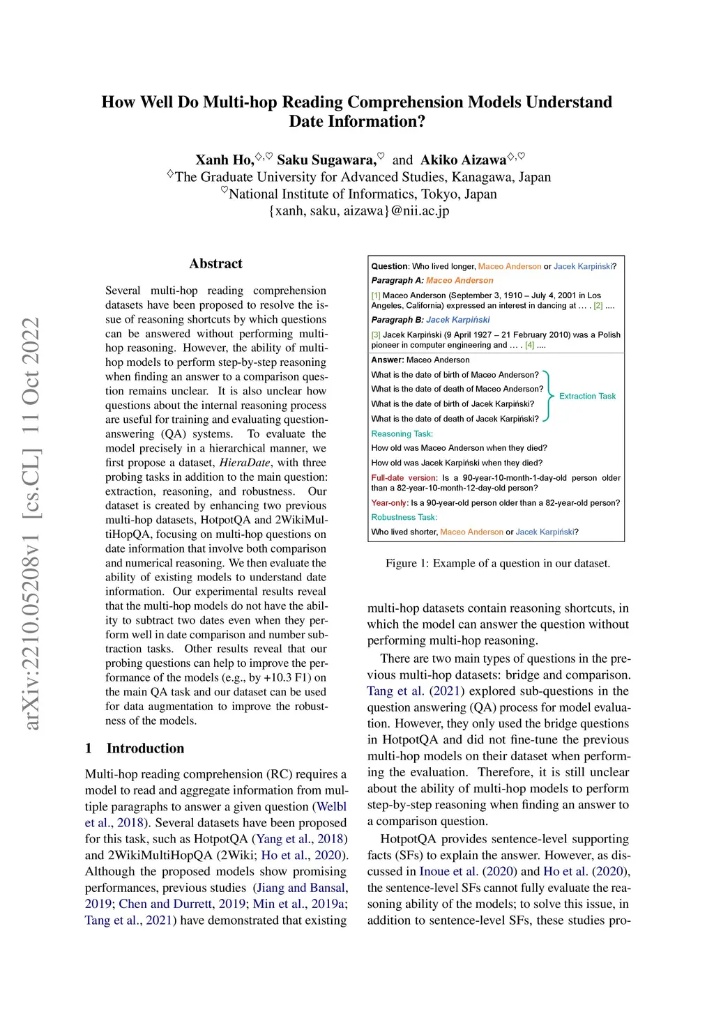 Several multi-hop reading comprehension datasets have been proposed to resolve the issue of reasoning shortcuts by which questions can be answered without performing multi-hop reasoning. However, the ability of multi-hop models to perform step-by-step reasoning when finding an answer to a comparison question remains unclear. It is also unclear how questions about the internal reasoning process are useful for training and evaluating question-answering (QA) systems. To evaluate the model precisely in a hierarchical manner, we first propose a dataset, \textit{HieraDate}, with three probing tasks in addition to the main question: extraction, reasoning, and robustness. Our dataset is created by enhancing two previous multi-hop datasets, HotpotQA and 2WikiMultiHopQA, focusing on multi-hop questions on date information that involve both comparison and numerical reasoning. We then evaluate the ability of existing models to understand date information. Our experimental results reveal that the multi-hop models do not have the ability to subtract two dates even when they perform well in date comparison and number subtraction tasks. Other results reveal that our probing questions can help to improve the performance of the models (e.g., by +10.3 F1) on the main QA task and our dataset can be used for data augmentation to improve the robustness of the models.