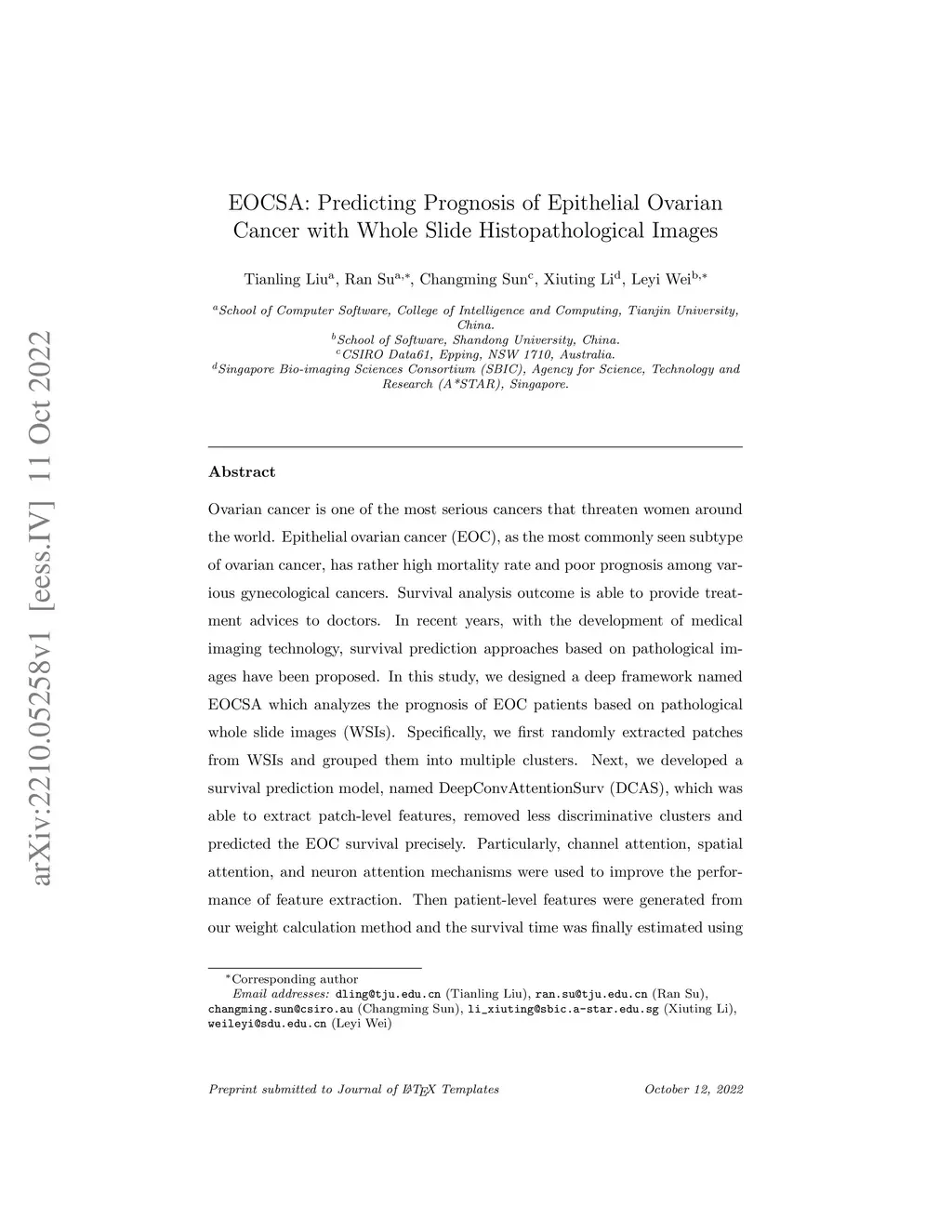EOCSA: Predicting Prognosis of Epithelial Ovarian Cancer with Whole