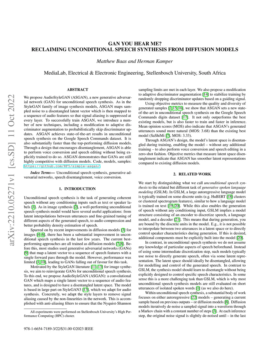 We propose AudioStyleGAN (ASGAN), a new generative adversarial network (GAN) for unconditional speech synthesis. As in the StyleGAN family of image synthesis models, ASGAN maps sampled noise to a disentangled latent vector which is then mapped to a sequence of audio features so that signal aliasing is suppressed at every layer. To successfully train ASGAN, we introduce a number of new techniques, including a modification to adaptive discriminator augmentation to probabilistically skip discriminator updates. ASGAN achieves state-of-the-art results in unconditional speech synthesis on the Google Speech Commands dataset. It is also substantially faster than the top-performing diffusion models. Through a design that encourages disentanglement, ASGAN is able to perform voice conversion and speech editing without being explicitly trained to do so. ASGAN demonstrates that GANs are still highly competitive with diffusion models. Code, models, samples: https://github.com/RF5/simple-asgan/.
