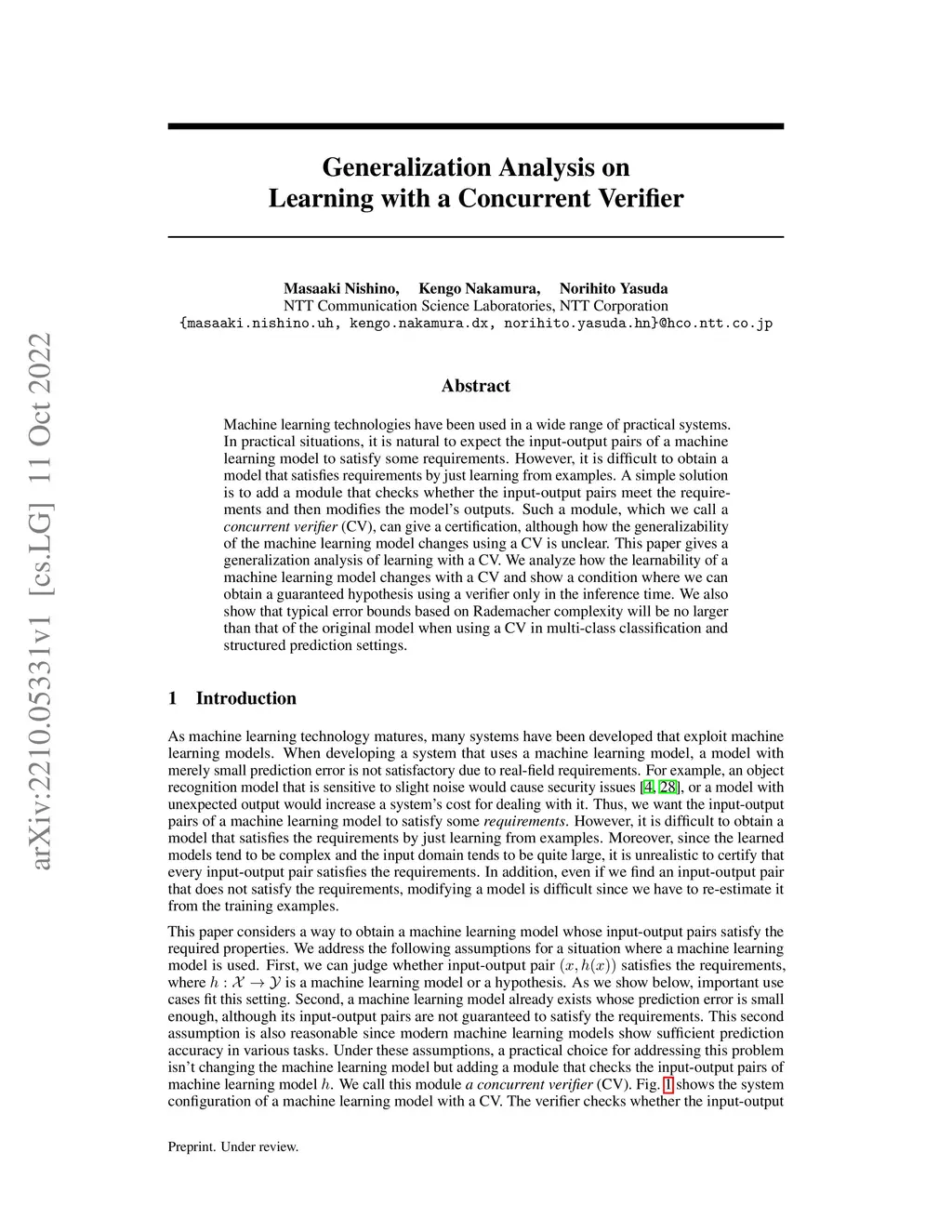 Machine learning technologies have been used in a wide range of practical systems. In practical situations, it is natural to expect the input-output pairs of a machine learning model to satisfy some requirements. However, it is difficult to obtain a model that satisfies requirements by just learning from examples. A simple solution is to add a module that checks whether the input-output pairs meet the requirements and then modifies the model's outputs. Such a module, which we call a {\em concurrent verifier} (CV), can give a certification, although how the generalizability of the machine learning model changes using a CV is unclear. This paper gives a generalization analysis of learning with a CV. We analyze how the learnability of a machine learning model changes with a CV and show a condition where we can obtain a guaranteed hypothesis using a verifier only in the inference time. We also show that typical error bounds based on Rademacher complexity will be no larger than that of the original model when using a CV in multi-class classification and structured prediction settings.