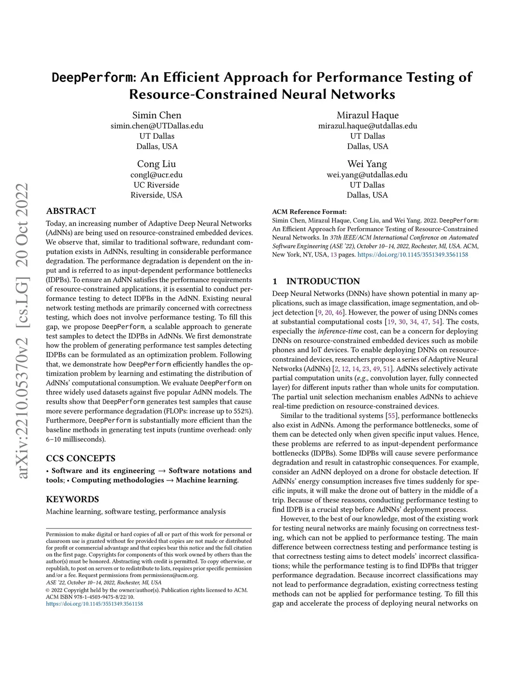 Today, an increasing number of Adaptive Deep Neural Networks (AdNNs) are being used on resource-constrained embedded devices. We observe that, similar to traditional software, redundant computation exists in AdNNs, resulting in considerable performance degradation. The performance degradation is dependent on the input and is referred to as input-dependent performance bottlenecks (IDPBs). To ensure an AdNN satisfies the performance requirements of resource-constrained applications, it is essential to conduct performance testing to detect IDPBs in the AdNN. Existing neural network testing methods are primarily concerned with correctness testing, which does not involve performance testing. To fill this gap, we propose DeepPerform, a scalable approach to generate test samples to detect the IDPBs in AdNNs. We first demonstrate how the problem of generating performance test samples detecting IDPBs can be formulated as an optimization problem. Following that, we demonstrate how DeepPerform efficiently handles the optimization problem by learning and estimating the distribution of AdNNs' computational consumption. We evaluate DeepPerform on three widely used datasets against five popular AdNN models. The results show that DeepPerform generates test samples that cause more severe performance degradation (FLOPs: increase up to 552\%). Furthermore, DeepPerform is substantially more efficient than the baseline methods in generating test inputs(runtime overhead: only 6-10 milliseconds).