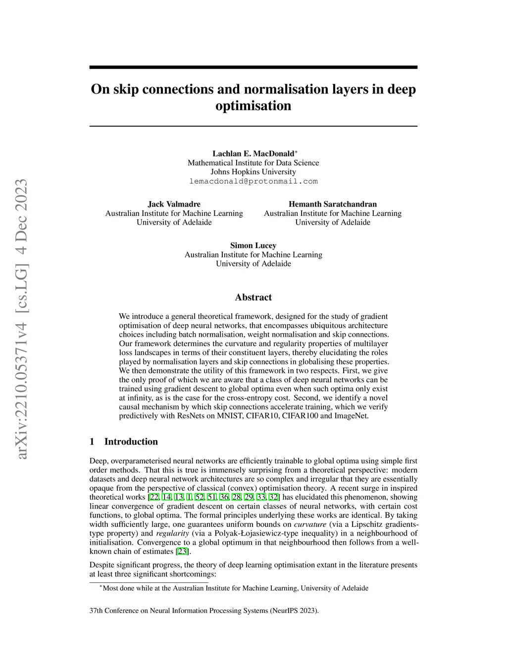 On skip connections and normalisation layers in deep optimisation